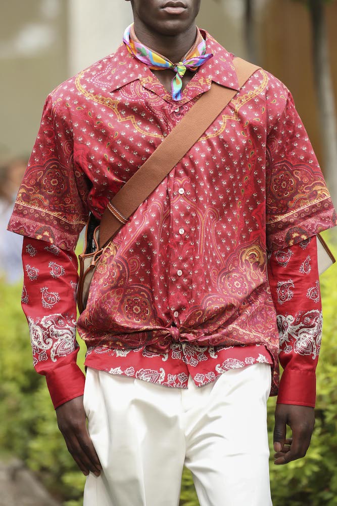 Ma il messaggio positivo di Etro si traduce anche nel suo impegno costante verso la sostenibilità. Così, per la collezione ha utilizzato una serie di tessuti eco-friendly e dato una seconda vita a materiali d’archivio, innescando un processo di upcycling. Tutti identificati dalla speciale etichetta Benetroessere, questi pezzi unici includono jeans patchwork e giacche realizzate con tessuti vintage, mentre le camicie e le polo sono create rispettivamente con filati di eucalipto e con tessuti ottenuti dal riciclo di bottiglie di plastica.