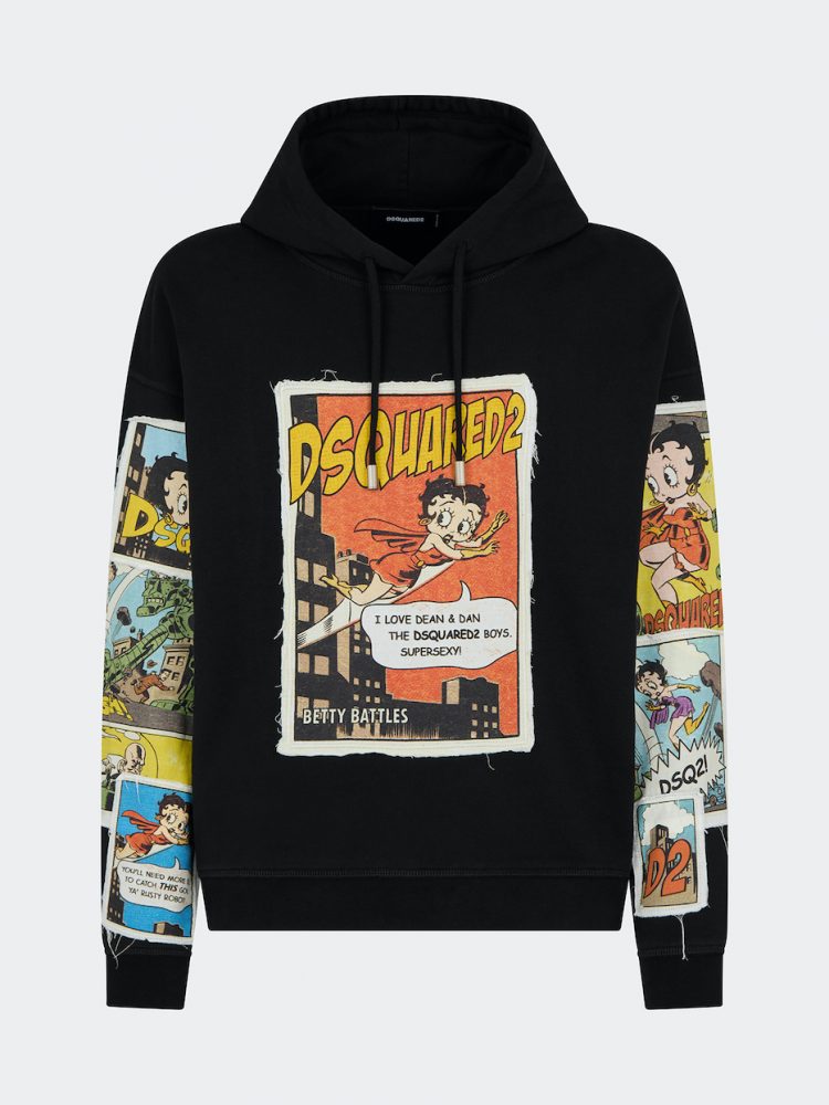Per tutti gli appassionati di cartoons, Dsquared2 presenta una capsule collection in collaborazione con Betty Boop. L’eroina dalla femminilità iconica e divertente decora una selezione di capi e accessori, tra cui questa felpa nera con cappuccio decorata con scene di fumetti.