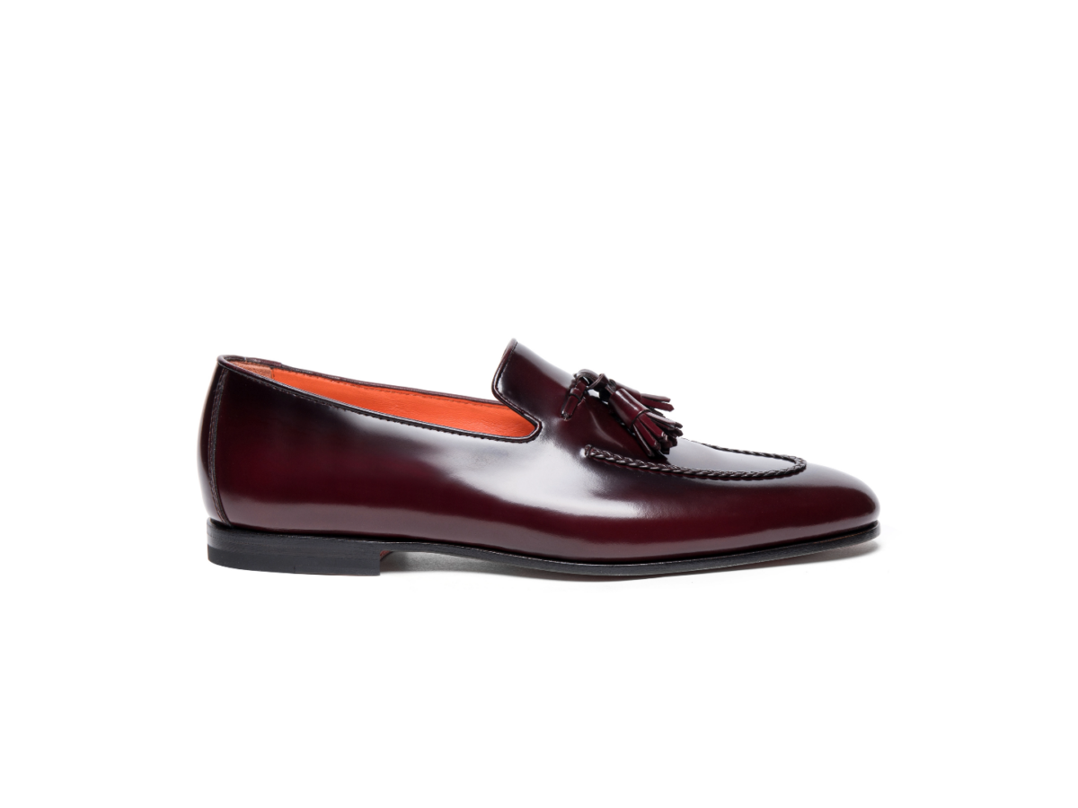 Reinterpretando in chiave moderna un classico d’archivio, Santoni propone un loafer dal design slanciato e leggero con la scollatura ampia che lascia scoperta la caviglia e il tacco smussato. Il modello è realizzato in pelle smaltata dall’effetto lucido ed è decorato con nappine e vaschetta cucita. Si caratterizza per la speciale costruzione Goodyear che rende la scarpa morbida e flessibile.