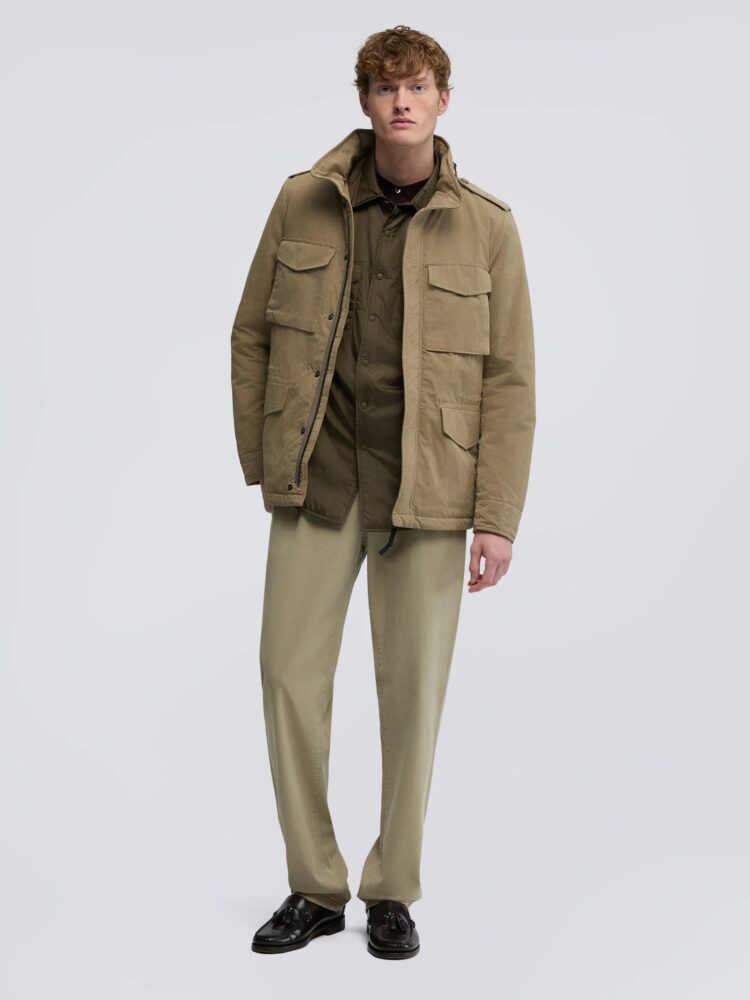 Poi, la terza protagonista della stagione è la field jacket. La sua origine è pratica: tasche capienti, tessuti resistenti e una struttura pensata per il movimento. Stiamo parlando di una giacca militare che ha saputo sempre mantenere quell’aura leggermente avventurosa che la distingue dagli altri capispalla. Ma per la primavera 2026 appare alleggerita, grazie a cotoni cerati più sottili e silhouette meno rigide rispetto alle versioni militari originali. Le quattro tasche frontali restano il segno distintivo, insieme ai colori naturali che richiamano il mondo outdoor.