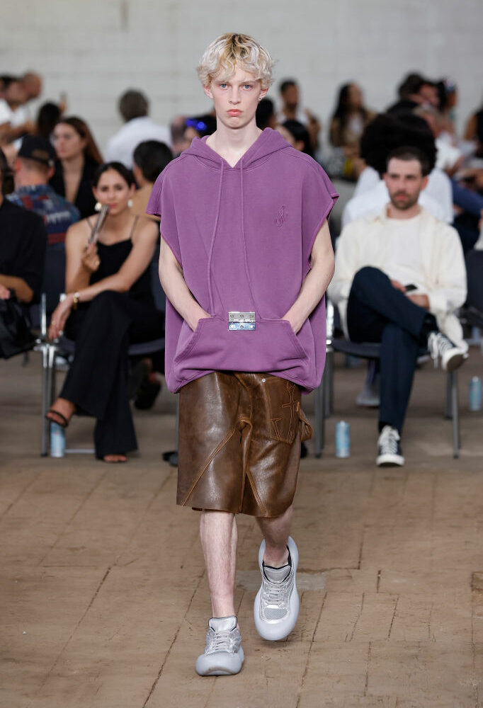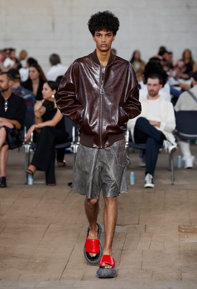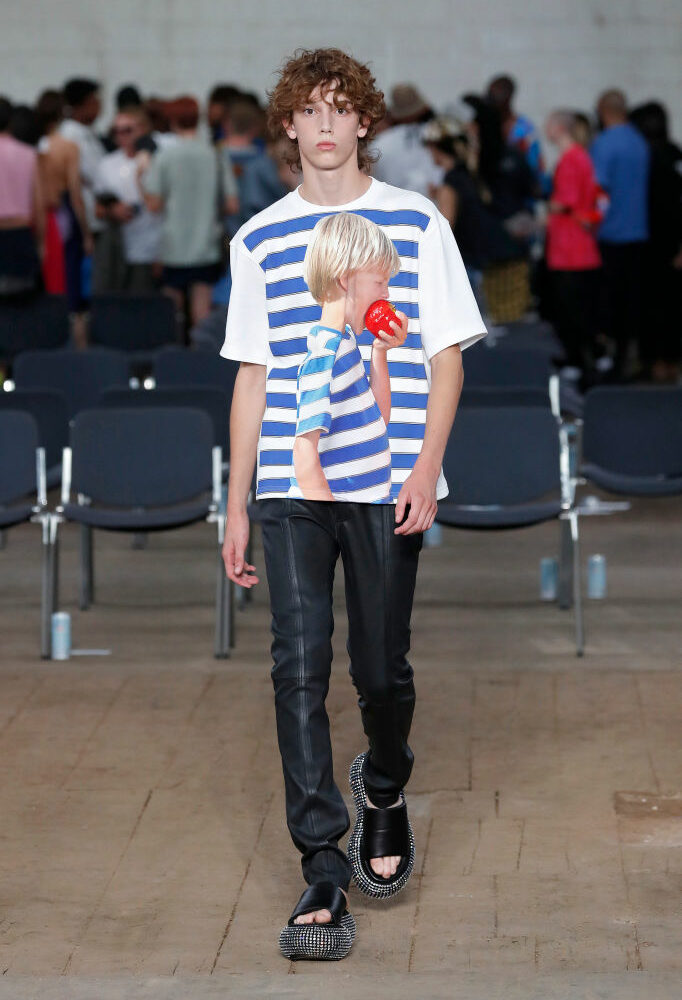 Sembra una gioventù scassata che sbatte e si scontra con quello che la circonda. Assistendo alla sfilata di Jonathan Anderson, per la prossima primavera estate 2023, vengono in mente le peripezie degli scalmanati di jackass, il programma tv in onda su MTV nei primi 2000, in cui un gruppo di ragazzi si divertiva a tentare imprese impossibili, pericolose e dolorose per puro divertimento (e masochismo, aggiungerei), ma qui trasformati in versione cartone animato. Cosi gli skateboard spezzati o i manubri delle biciclette si infilano nei maglioni, il cardine della porta o i coperchi delle latte di pelati si attaccano alle felpe, i jeans sono strappati, ma come si vede nei fumetti. Ma l’attitudine giocosa di Anderson non si esprime solo con trovate sceniche, il suo sottile humour raggiunge l’acme con il volto di Rembrandt, stampato su pullover leggeri e slip on, nel suo famoso autoritratto del 1630 dove, come in un selfie, ha una espressione tra il sarcastico e il divertito come per dire: ‘tutto bene?’, espressione tipica dello slang giovanile di oggi. In questo il designer nord irlandese è maestro e lo infonde nelle collezioni senza mai essere eccessivo. Anche le calzature sono d’impatto con zatteroni con la zeppa completamente coperta di strass luccicanti. I jacquard della maglieria, poi, sono QR code o codici a barre che disegnano semplici motivi in bianco e nero portati con ampi bermuda effetto pelle.