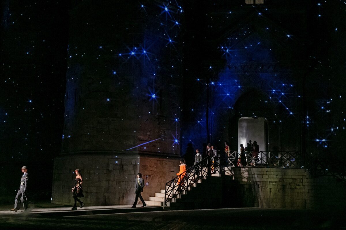 Il viaggio di Michele si manifesta così in uno spettacolo inteso, lui stesso lo ha definito come un rave in cui le sue capacità di costumista rafforzate dalla teatralità del luogo hanno trovato la sua massima manifestazione. Illuminati dalla luce della luna piena la costellazione di personaggi vestiti di velluti e tessuti sontuosi hanno tradotto la sua idea di cosmogonia. Ecco quindi romantiche eroine avvolte in metri di velluto e pudiche signore borghesi, amanti avvolte in stivali e abiti di pelle. E poi cavalieri e uomini in uniforme con colletti ricamati e strascichi di tulle, cappe medievali e mantelli luminosi.