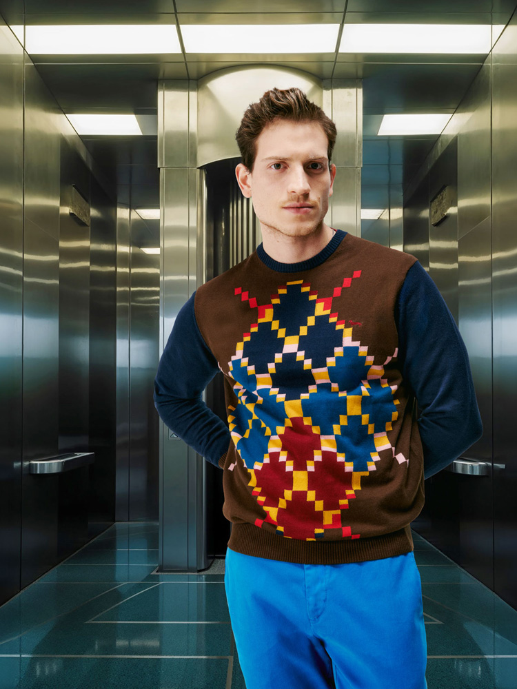 I motivi Argyle della maglieria sono ristilizzati in disegni futuristici dall’effetto pixellato.