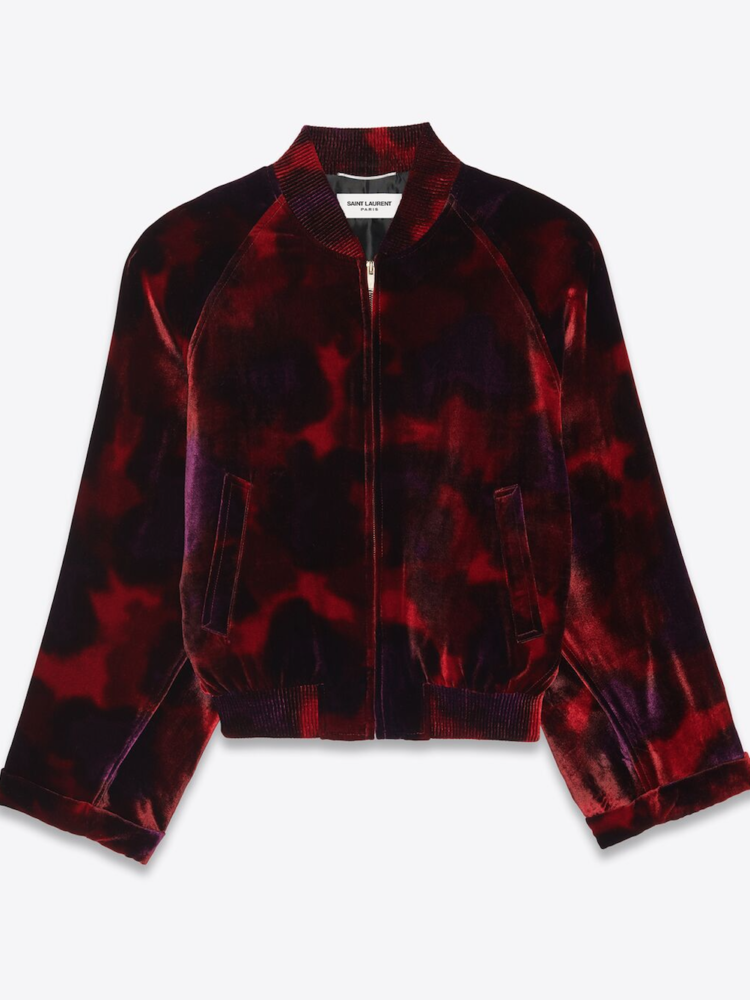 SAINT LAURENT – Questo giubbotto Teddy ha sfilato a Venezia lo scorso luglio, durante l’evento di presentazione della collezione uomo SS 2022. Anthony Vaccarello ha esplorato gli archivi della maison, così nasce questo bomber in velluto dalle maniche a kimono che evoca l’Oriente, da sempre fonte d’ispirazione per il couturier Yves Saint Laurent.
