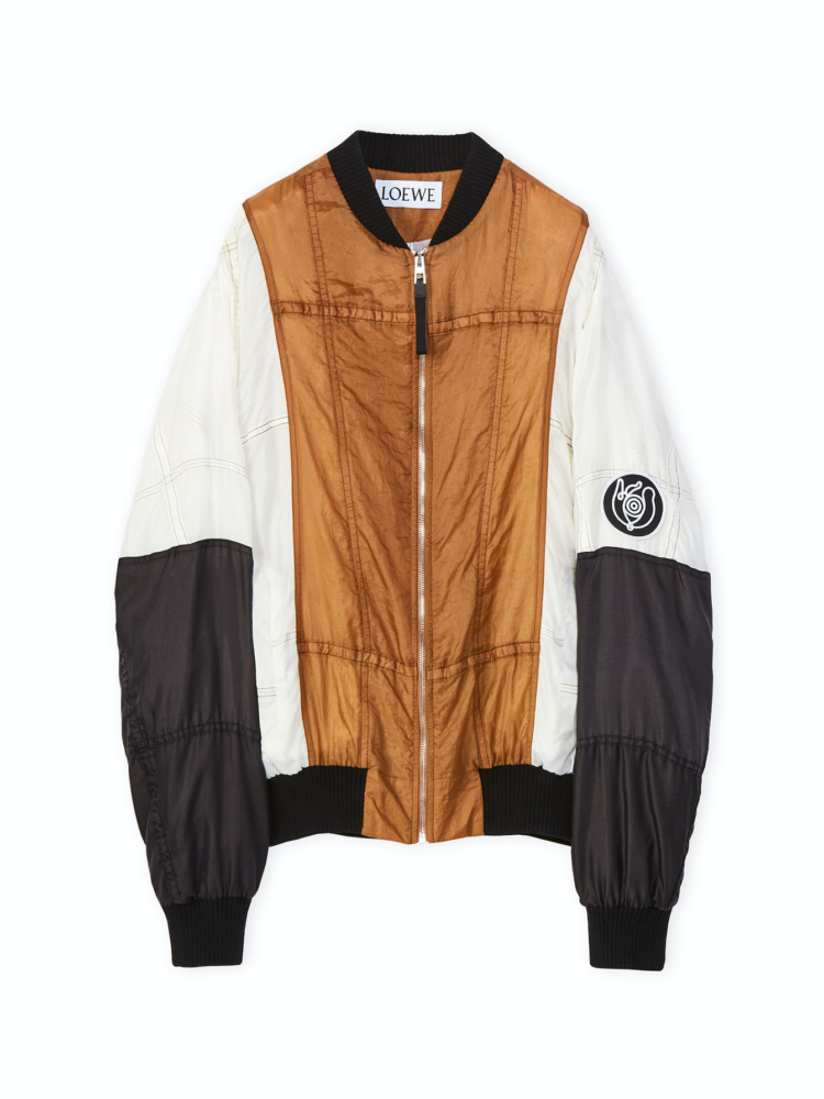 Eye/LOEWE/Nature – Concepita per vivere all’aperto, a stretto contatto con la natura, questa collezione è creata da Jonathan Anderson utilizzando pezzi riciclati ottenuti da paracaduti, attrezzatura militare, tende e da magliette Loewe di stagioni precedenti. I classici capi da esterno hanno linee semplici, funzionali e volumi morbidi, come questo bomber “paracadute” in tessuto patchwork.