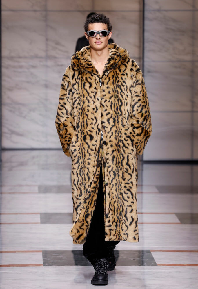 Ma non soltanto formale, Armani si diverte a provocare con lunghi cappotti di fake fur stampati come il manto del leopardo oppure con look sportivi tra l’active e l’equitazione con i pantaloni infilati negli stivali. ‘Gli uomini che escono dai meravigliosi edifici della nostra città non devono per forza indossare solo smoking’, commenta. ‘ Un tempo da quei portoni uscivano a cavallo ora invece lo fanno per andare a fare sport’. Ma gli smoking ci sono, nel finale una serie di modelli in abito da sera sono in nero ma scintillanti, un inno alla coppia senza nessun altro significato. ‘È semplicemente il racconto dell’amore tra un uomo e una donna e mi faceva piacere farlo vedere’.