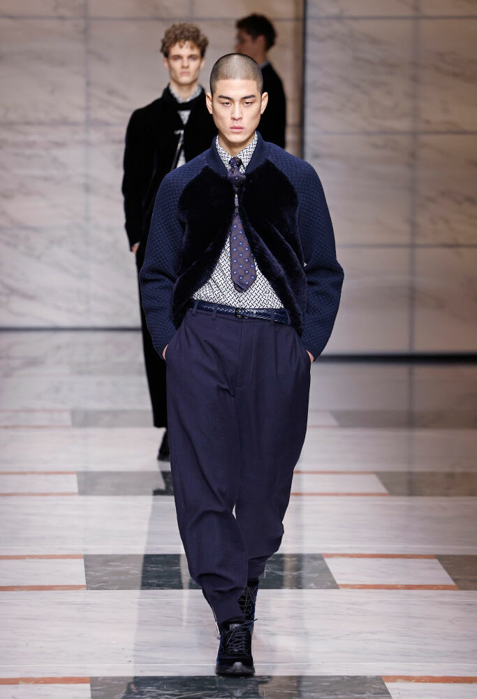 ‘Torna milano’, commenta Giorgio Armani dopo la sfilata.’ Nella sua tradizione dei vecchi palazzi, degli atri che nascondono giardini bellissimi, un senso di serenità che si ritrova anche nel centro della città che intanto fuori corre. ‘Sono ispirato da quello che mi circonda dal mio ufficio, dalle strade in cui vivo’ racconta. Per il prossimo autunno inverno 2023/24 Armani porta in passerella un uomo sofisticato e pacato che riscopre un’eleganza classica. ‘Trovo che sia giusto avere l’abito adatto per ogni occasione, se ci si siede in un tavolo importante dove si decidono cose importanti è necessario essere adeguatamente vestiti. Per questo, per esempio, i completi doppiopetto sono altamente formali, ma con una costruzione contemporanea. Il brutto e lo strano oggi resi fashion non fanno parte del mio linguaggio. Mi piace però, per esempio, vedere una cravatta leggermente sollevata, è quella piccola trasandatezza che regala una eleganza rilassata’, quella che lo ha reso un’icona della moda.