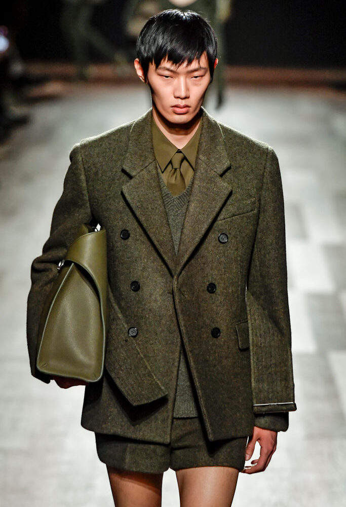 Eppure, per vestirsi eleganti può bastare un capospalla che ricordi la tradizione sartoriale. Louis Vuitton, ad esempio, ha proposto un cappotto con loghi finemente cosparsi e cintura intorno ai fianchi per regolare il fit. Questo indumento fa tutto perché monopolizza l’outfit, servendosi poi di un buon maglione abbinato a comodi calzoni.