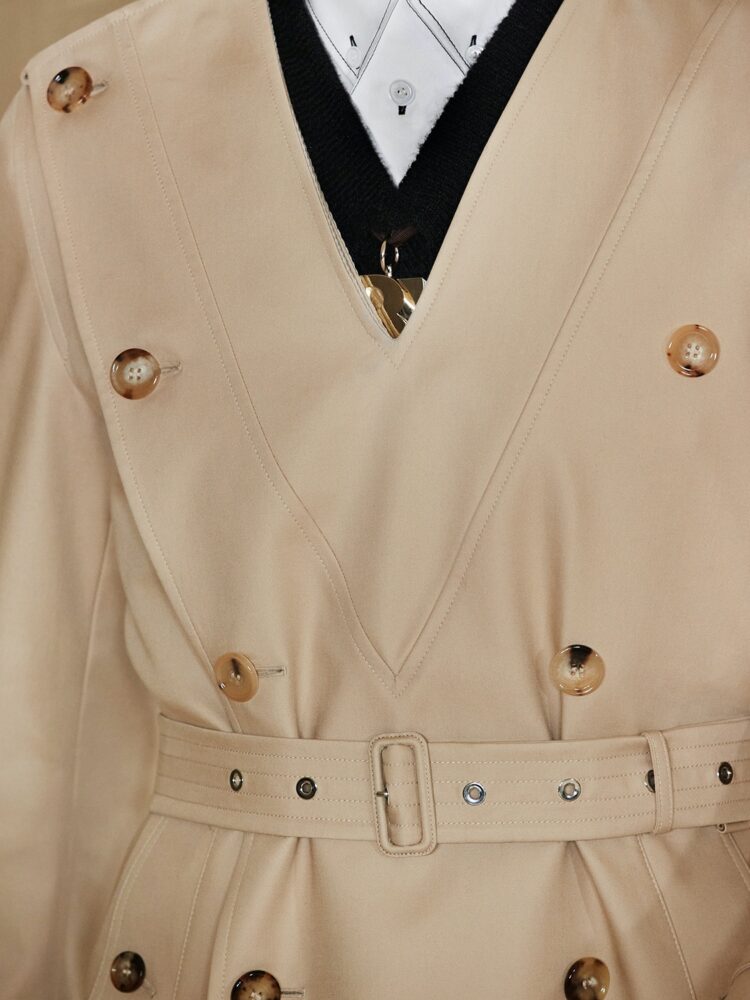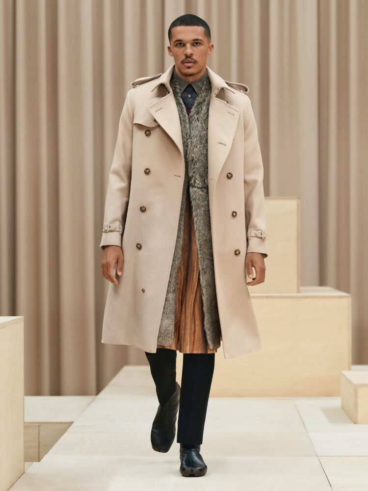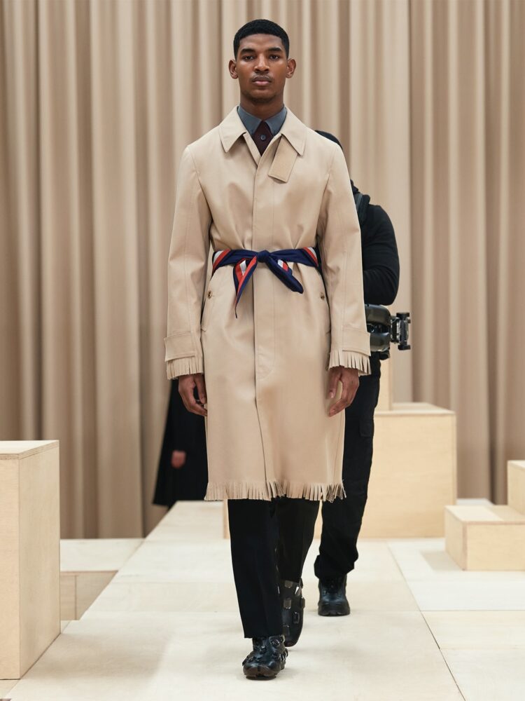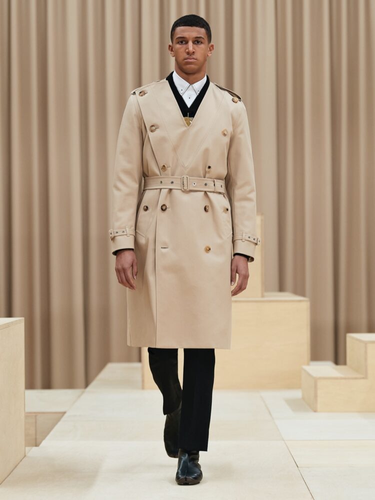 Il lavoro di Tisci è una rivisitazione del classico con una nuova prospettiva in cui il trench viene combinato con la giacca Harrington. Nell’insieme i pezzi multistrato si trasformano inaspettatamente sul corpo dando vita ad una nuova sartoria che celebra da una parte i codici estetici della maison britannica, mentre dall’altra dissestano gli ideali classici.