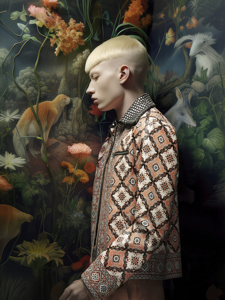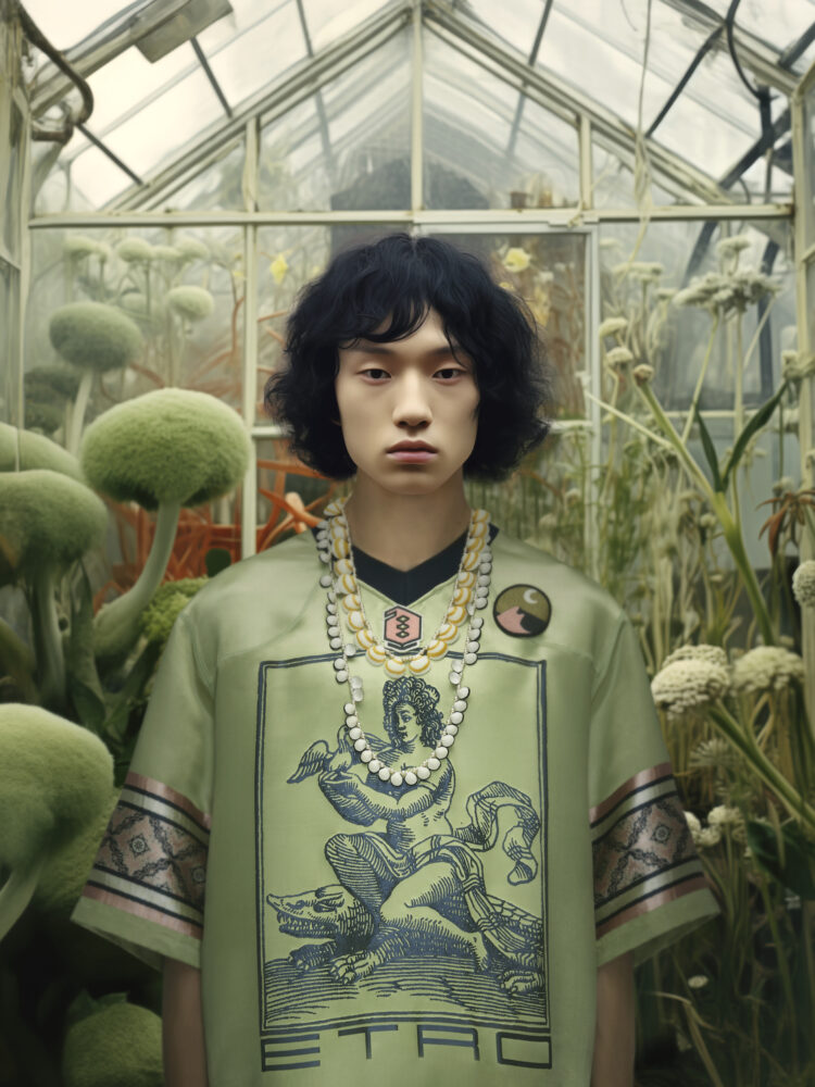 Se gli interrogativi sull’intelligenza artificiale animano il presente, Marco De Vincenzo ci mostra le sue infinite possibilità in ambito creativo, applicandola nell’ambito delle campagne moda. Il direttore creativo, infatti, conversa con la digital artist e prompt designer Silvia Badalotti per realizzare una serie di scene e quadri proprio attraverso l’AI. Grazie ad input verbali, la macchina riproduce il pensiero creativo in immagini. Sono di invenzione gli scenari, così come i corpi, familiari e alieni. Così l’umano dialoga con il meccanico, ma niente sarebbe possibile senza uno solo degli attori coinvolti.
