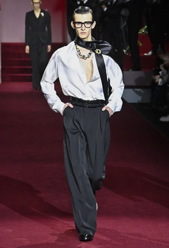 Cosa mai sarebbe la sera del 31 dicembre senza un look elegante nella propria peculiare disinvoltura, senza rinunciare agli eccessi che arricchiscono l’insieme per ottenere un abbinamento facile da replicare, quanto da modificare aggiungendo o togliendo elementi come foulard, gioielli e doppia cintura. Alla Dolce&Gabbana maniera nella collezione autunno inverno 2025 2026, presentata durante la Milano Fashion Week.