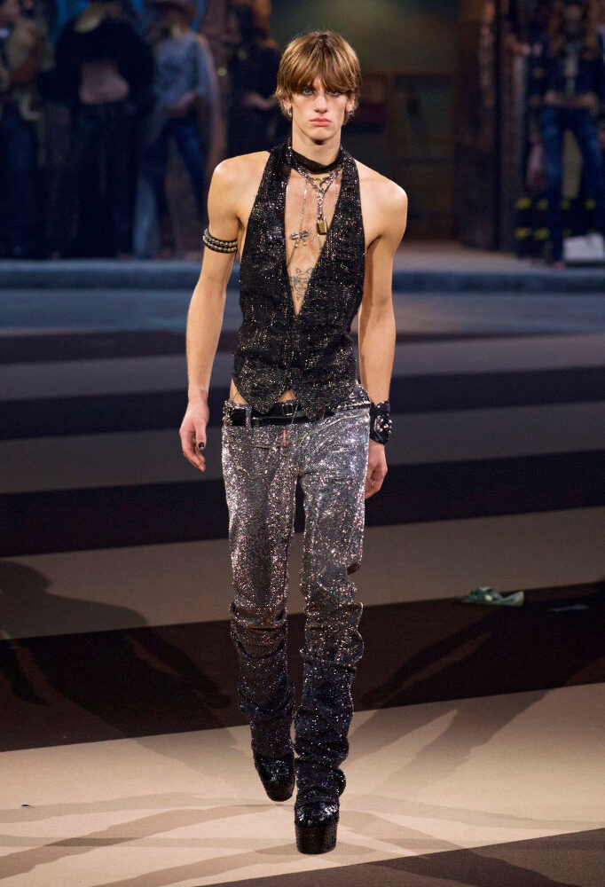Ma non è Capodanno se non ci sono brillantini, paillettes, punti luce. Dsquared2, con i suoi look disco-coded, dà spazio agli uomini che sperimentano coraggiosamente con il proprio corpo e anche gli strass. Il risultato? Un completo gilet (da indossare a nudo) e pantaloni che cadono sugli stivali dotati di plateau. Pronti per andare a ballare, accogliendo con grinta l’anno che verrà.