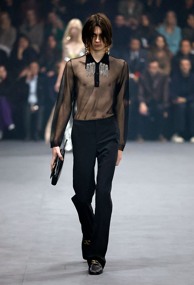 Sottrarre sopra, aggiungere sotto. Lo fa Alessandro Michele da Valentino per creare un look composto da morbidI, però ben strutturati, pantaloni neri e blusa see-through impreziosita da gioielli. Sexy ma raffinato, genderless ma chiaro, semplice ma d’effetto. Nel pieno spirito della Maison, che regala ispirazioni per un Capodanno danzante.