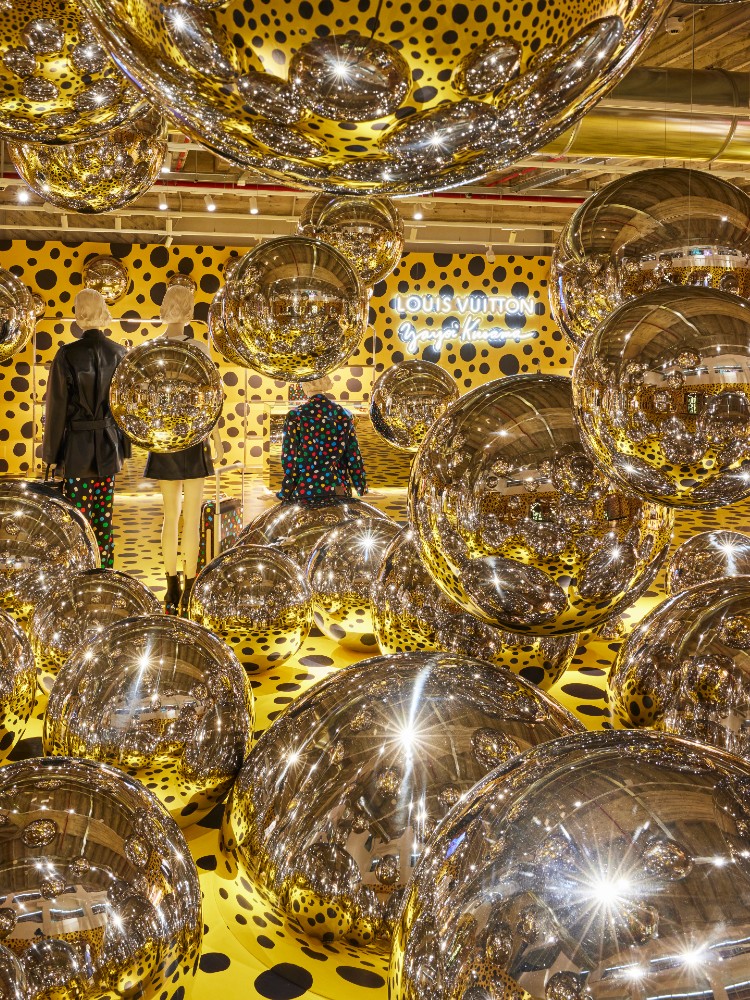 All’interno dello spazio sono svelati i prodotti frutto di questa straordinaria collaborazione fatta di borse, scarpe e abbigliamento femminile e maschile, occhiali da sole, fragranze e gioielli, tutti contaminati dai motivi e le immaginazioni dell’infinito dell’artista giapponese.