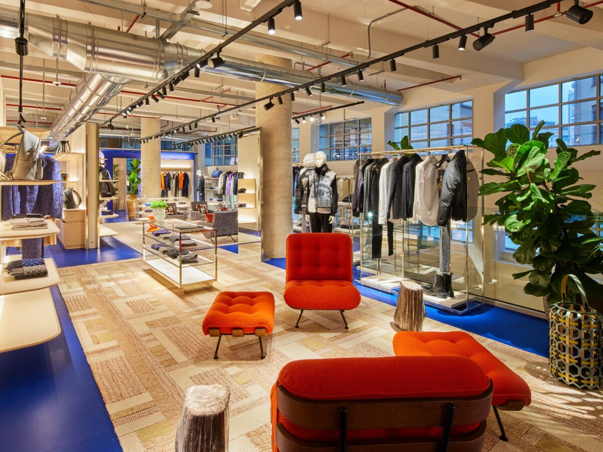 Louis Vuitton è riuscito con questo rinnovamento e allestimento a valorizzare e custodire la straordinaria architettura degli anni Trenta. Grazie a un sistema di pareti curve, infatti, le  monumentali travi a ventaglio sono lasciate a vista e perfettamente integrate con il progetto. Ma clienti e visitatori hanno l’opportunità di un’esperienza di acquisto unica, circondati da arredi di design italiano vintage, opere d’arte e oggetti d’archivio di Louis Vuitton e pezzi artigianali creati appositamente per il nuovo spazio.