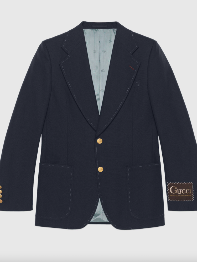 Gucci presenta giacche sartoriali protagoniste di look scomposti, realizzate con tessuti raffinati o materiali casual. Questo modello in cotone blu, per esempio, può essere indossato come abito coordinato o con pantaloni in denim, con una camicia bianca oppure fantasia, per infrangere le regole del tailoring.