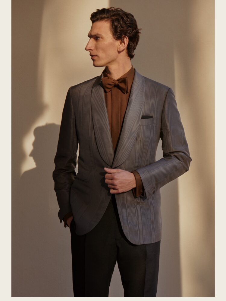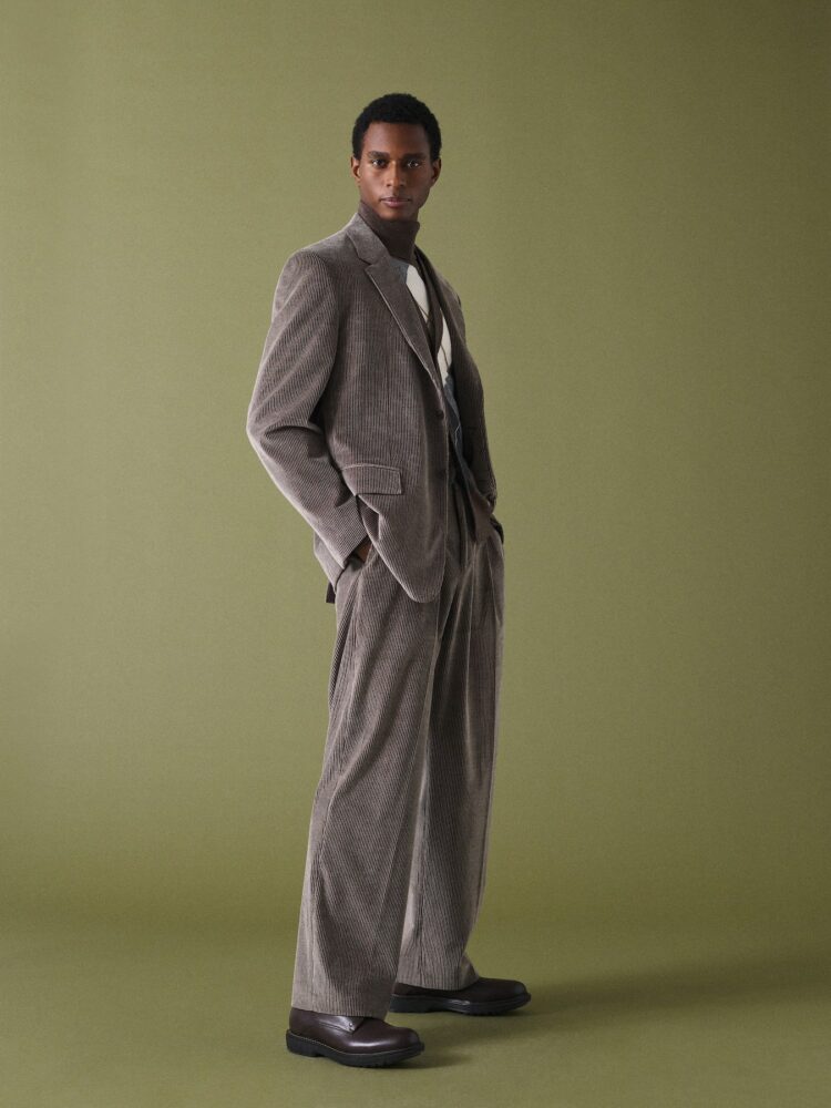Si conferma l’approccio morbido alla sartorialità di Brioni che, per l’Autunno/Inverno 2023, presenta capi fluidi e disinvolti che accompagnano il corpo e i gesti, ma che nascondono il più fine lavoro manuale e un’attenta ricerca dei materiali. Le giacche sono più lunghe, i pantaloni più ampi, le spalle sono definite ma leggere, mentre la pelle aggiunge consistenza e texture a blouson in vitello e blazer tagliati in coccodrillo recycled selezionato dagli archivi.