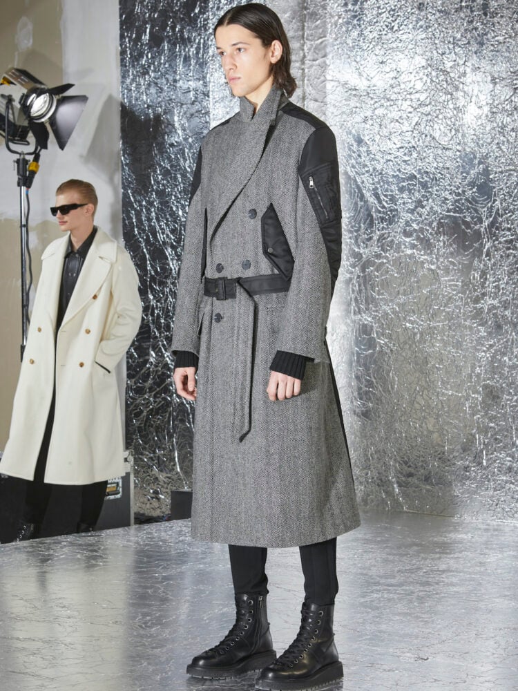 La collezione FW23 disegnata dallo stilista inglese è sviluppata intorno al concetto di individualità e si ispira a gruppi e sottoculture musicali, dal punk ai rocker, alla New Wave. Le pelli sono tagliate in camicie e pantaloni, tracksuit sono realizzati in rayon lucido e combinati con gli smoking, mentre il richiamo al grunge è evocato da maglie Fair Isle distorte. Tutto si mescola e tutto si evolve, resta una certezza però, la precisione sartoriale che caratterizza il lavoro di Neil Barrett fin dagli anni Novanta e che oggi crea uniformi per la vita reale che esaltano la personalità.