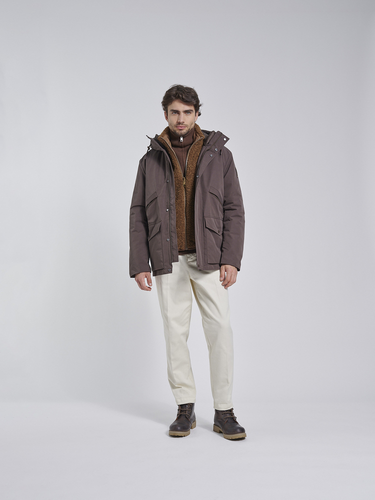 Parka e down jacket in materiali tecnici idrorepellenti, outerwear in poliesteri effetto lana e cappotti ispirati all’heritage britannico. Bomboogie propone un total look completo con maglieria in lana merino, misti performanti e cotone tinto a freddo, pelle dal carattere urbano, pantaloni in nuovi lavaggi e tessuti gabardine, bull, velluto, raso e nylon, oltre a cotoni compatti o fiammati. La palette combina toni moderni e audaci: beige caribou, coffee, grigi melange e iron, verdi fir e forest, blu poseidon e atlantic, verdone, burro, argan oil e whitewash.