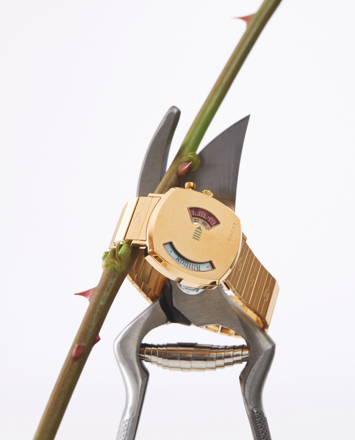GUCCI – Il Grip Roulette prende nome e ispirazione dal mondo dello skateboard (il grip è la superficie della tavola). Ed è altrettanto ludico e divertente. Questa versione non riporta solo l’indicazione di ore e minuti su dischi ro- tanti, ma dà anche una sorta di “oracolo”: basta premere il pulsante al 2 per veder apparire una scritta nell’apposita finestrella, fra le opzioni “chance, future, tenebrae, amour”. La cassa (38 mm) è in acciaio Pvd oro giallo, come il bracciale decorato dal logo. A 1.800 euro