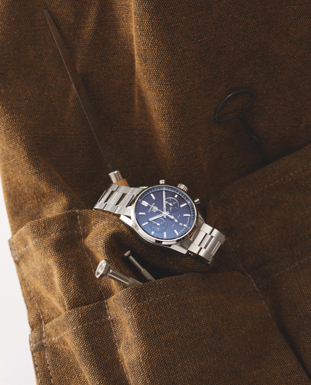 TAG HEUER – Creato per celebrare i 160 anni del brand, il nuovo Carrera presenta un’estetica simile all’originale, l’iconico cronografo lanciato nel 1963. Stessa lunetta lucida, stesso spirito racing, stessa impronta sport-chic. Ora però la cassa (42 mm) in acciaio è equipaggiata da un movimento di ultima generazione: il Calibre Heuer 02. Prodotto in-house, vanta la ruota a colonne e una notevole autonomia di 80 ore. N.B. Il quadrante blu è nell’identica nuance del Porsche GT Carrera. A 5.050 euro.