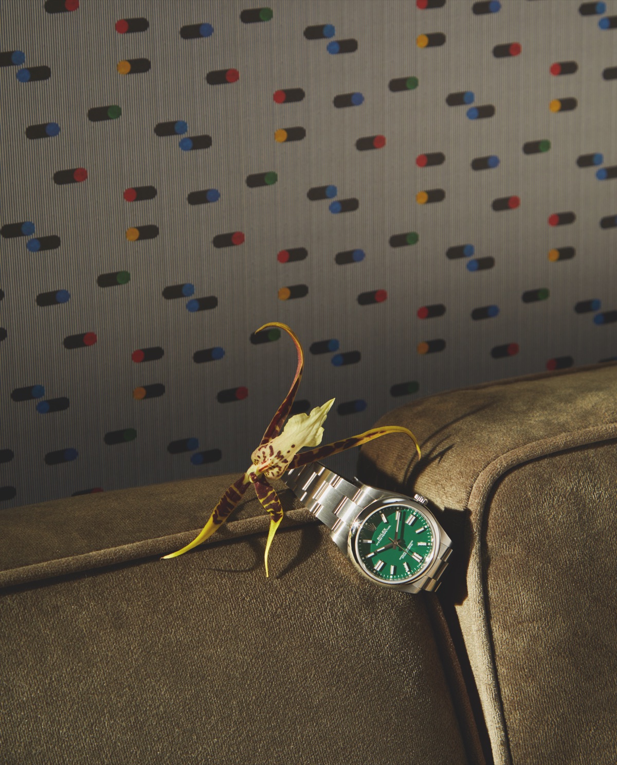 ROLEX — Un “grande classico” come non s’era mai visto. Un’esplosione di colore va a rinnovare il quadrante dell’Oyster Perpetual: oltre al verde qui fotografato, anche il corallo, il giallo saturo, il turchese (accanto ai più tradizionali nero, blu navy e argenté). La cassa (41 mm) è in acciaio Oystersteel come il bracciale Oyster; il movimento auto- matico è il calibro 3230, un concentrato di brevetti, quintessenza della tecnologia della Casa. Certificato Cronometro Superlativo. A 5.600 euro.