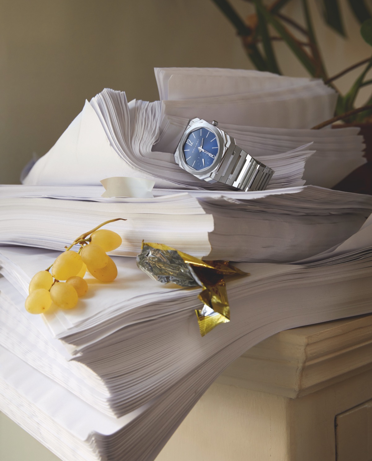 BULGARI — La pluripremiata collezione del gioielliere romano si arricchisce di un nuovo esemplare, con quadrante laccato blu. Interamente in acciaio lucido-satinato, l’Octo Finissimo Automatic presenta la cassa (40 mm) sottile solo 6,4 mm e impermeabile fino a 10 atm, con il bracciale integrato. Racchiude il calibro BVL 138 Finissimo, di manifattura, con micro-rotore decentrato in platino e 60 ore di autonomia. Che, con i suoi 2,3 mm di spessore, rimane un ultrapiatto da record. A 12.100 euro