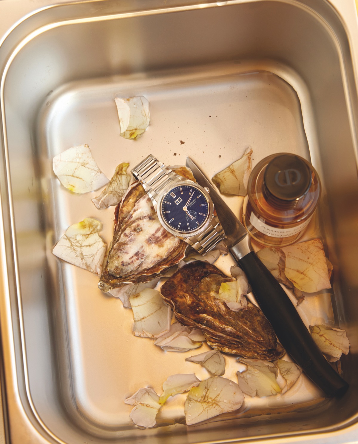TUDOR – Il nome deriva dall’anno di nascita dei primi orologi subacquei del brand, il 1958. Anche i 39 mm di diametro, il layout del quadrante, il bracciale rivettato sono tipici dell’epoca. Ma lo stile vintage del Black Bay Fifty-Eight Navy Blue è attualissimo, come il colore di tendenza e il movimento di manifattura. Nella cassa in acciaio, impermeabile fino a 20 atm, monta il calibro automatico MT 5402, con componenti in silicio e autonomia di 70 ore, certificato cronometro dal Cosc. A 3.500 euro.