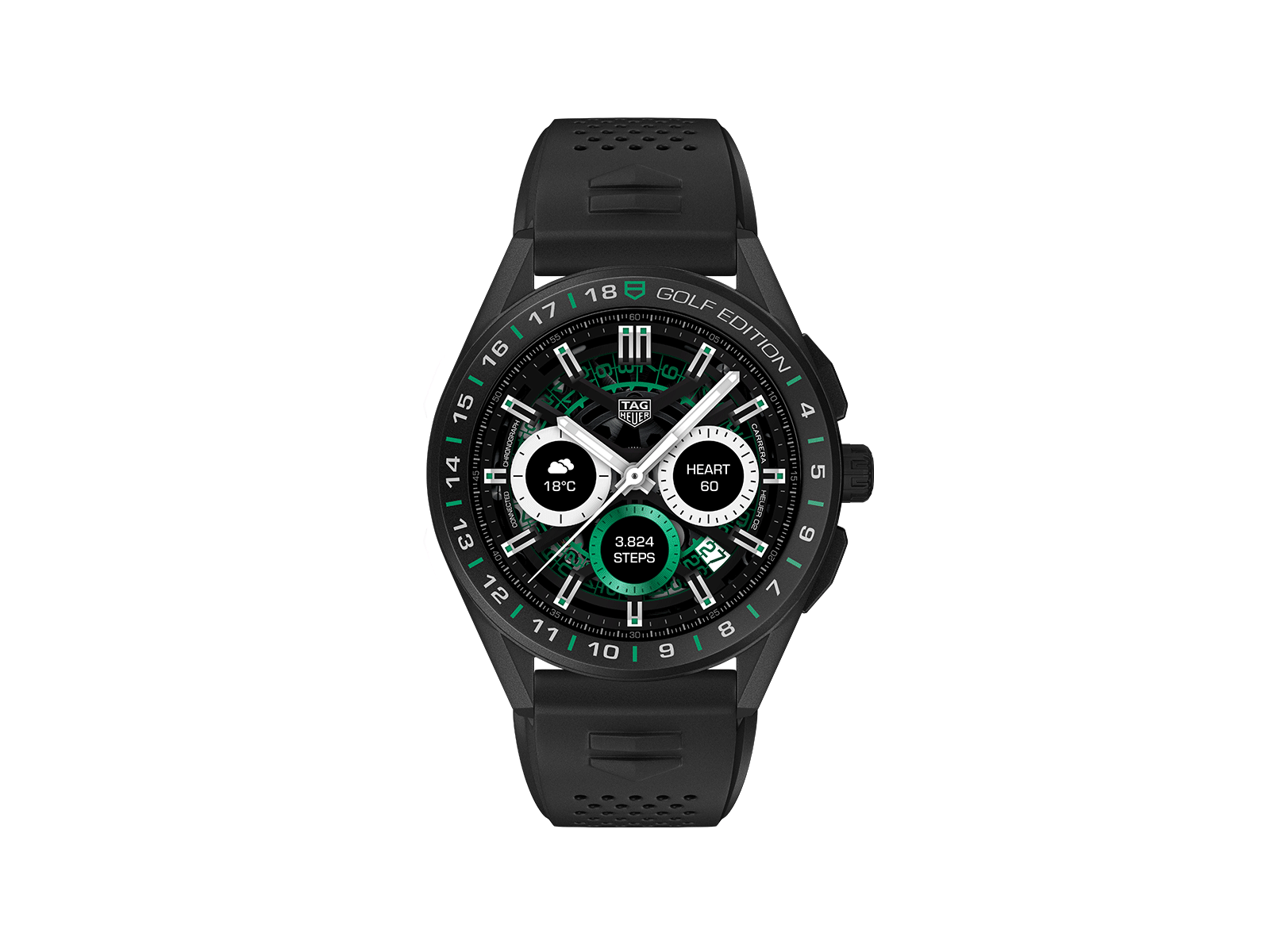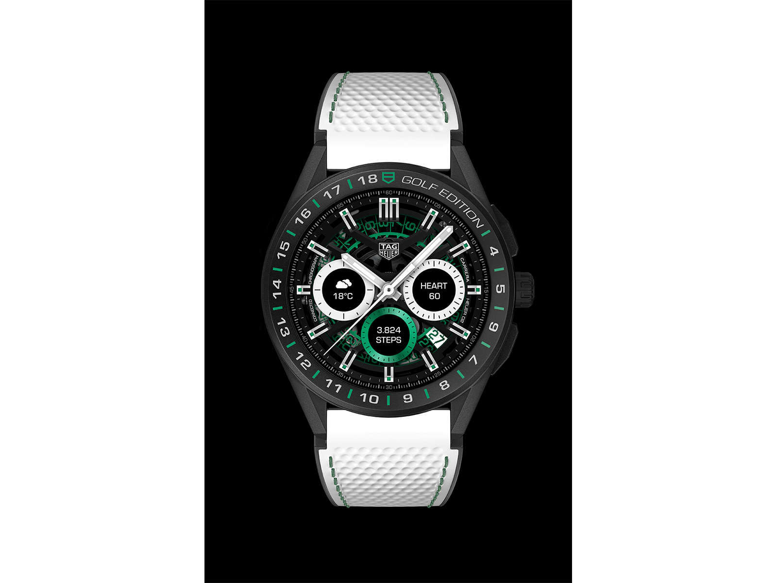Compagno ideale per gli appassionati di golf e per gli amanti dell’alta orologeria, questo modello Connected di lusso è perfetto da indossare tutti i giorni e non solo durante lo sport. È dotato di una cassa ultra-leggera in titanio nero da 45 mm e GPS, touchscreen OLED a filo ultra leggibile, e uno speciale cinturino in caucciù bianco con impunture verdi, oltre ad un secondo cinturino in caucciù traforato nero per un uso più formale. Grazie all’app TAG Heuer Golf, offre numerose funzioni: mappatura 3D, distanza degli ostacoli, monitoraggio dei tiri, schede segnapunti, statistiche professionali. Equipaggiato con Wear OS by Google, lo smartwatch supporta chi lo indossa in ogni attività della giornata con servizi indispensabili come Google Assistant e Google Translate, notifiche di e-mail e messaggi, Google Pay, oltre a controllo della musica, un’agenda, meteo, mappe e tutto ciò che serve per uno stile di vita connesso e attivo.