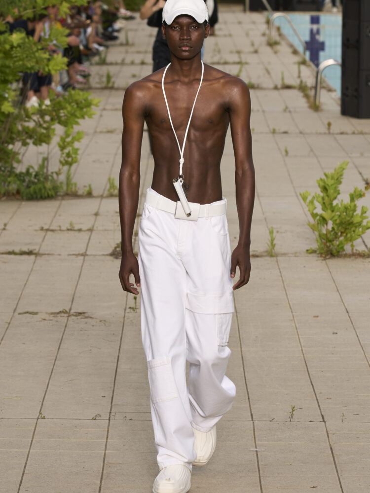 Sperimentare con forme e materiali fa parte del dna di 1017 moda, brand disegnato da Matthew Williams e parte della galassia Slam Jam, e continua a farlo per la prossima primavera estate 2023, intitolata Motion, e presentata nella piscina abbandonata Franco Sciaroni a nord di Milano, una bellissima struttura aperta nel 1957, ma poi chiusa per insanabili problemi di inagibilità. La collezione presenta molti spunti interessanti. I pantaloni dalla linea ampia sono pensati in un unico range di taglie unisex che si adatta al proprio stile e limita la produzione di troppi modelli, magari simili. Questa idea definisce anche una parte della silhouette della collezione perché è il perno intorno al quale viene costruito il resto del look, fatto di pezzi sportivi (alcuni parte della collaborazione con nike disponibile verso fine anno), che ha un forte accento Anni 90.