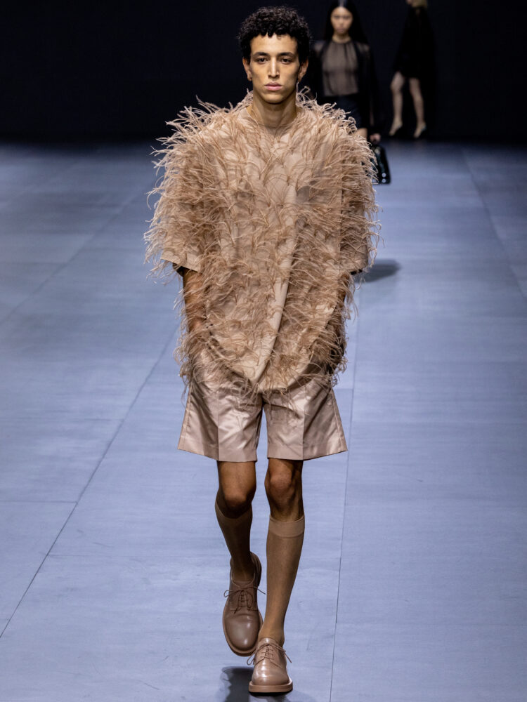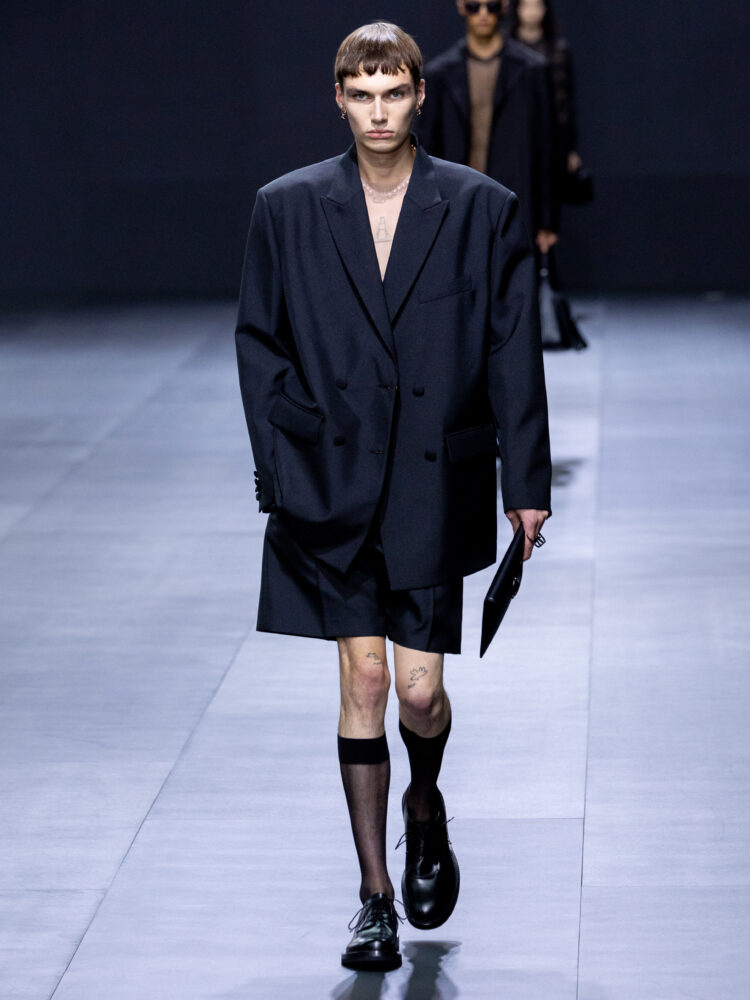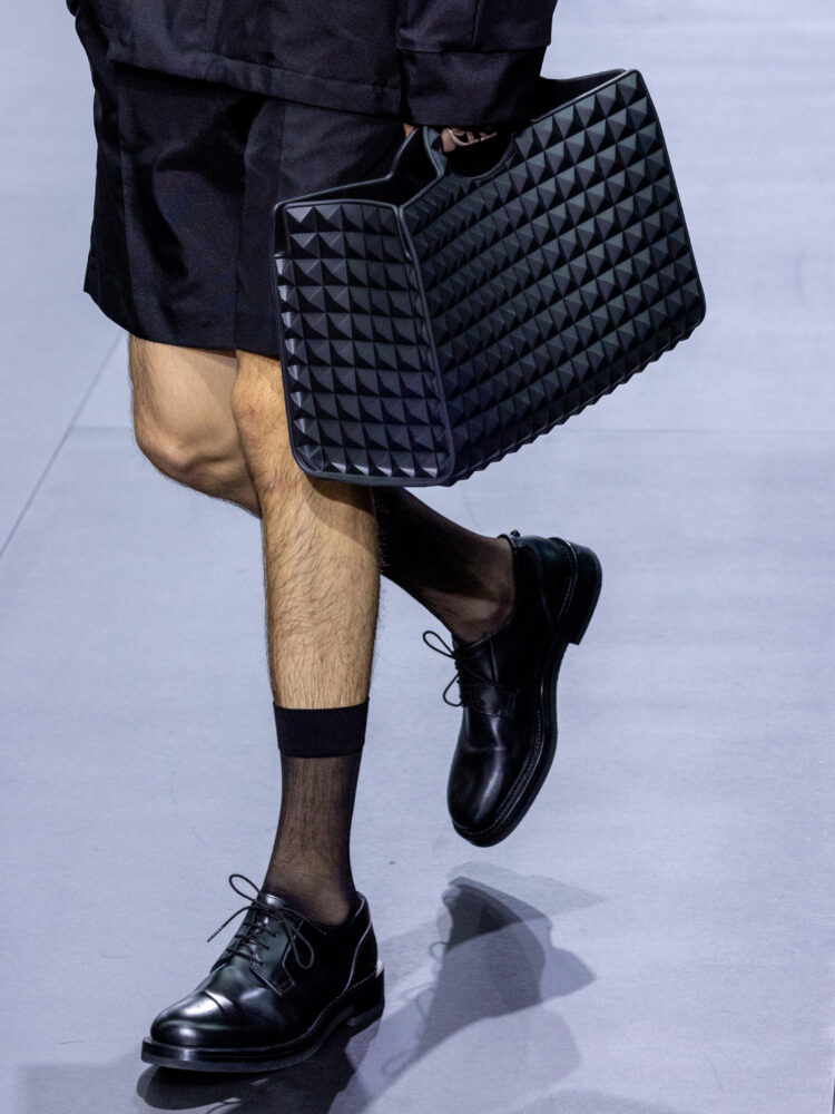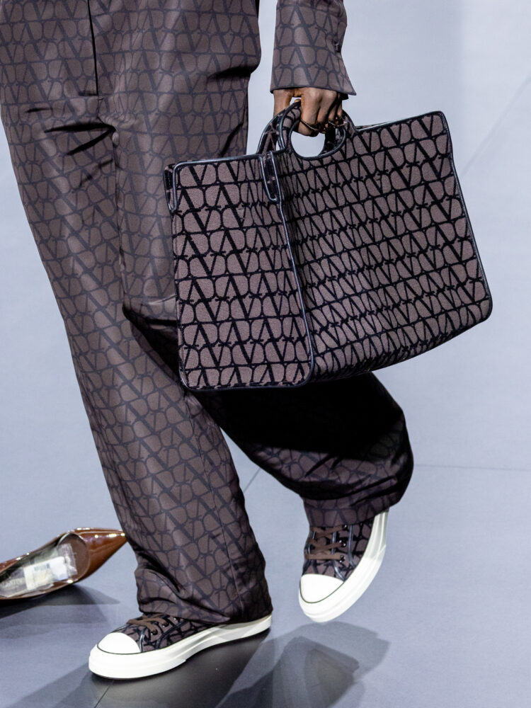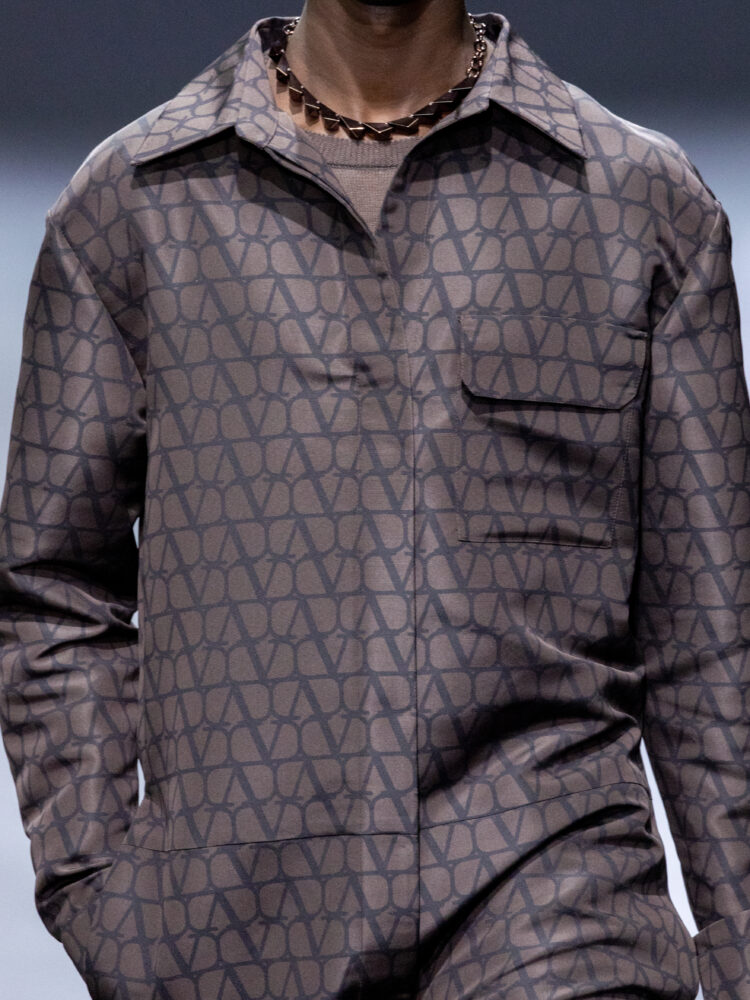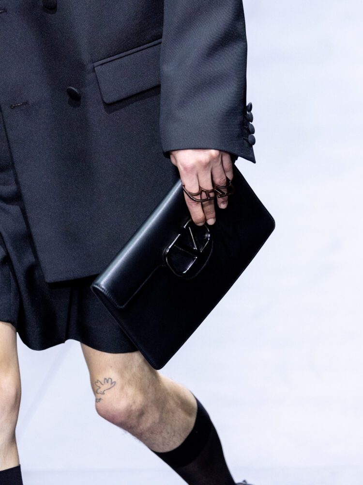 Unboxing significa scoprire, un invito a tirar fuori, far uscire idee e immagini, liberarsi dalla struttura per guardare dento la scatola, svelare ciò che realmente contiene. Corpo e abito si fondono, non esistono più size. I tessuti si adattano alla pelle tanto da prenderne il colore per creare un effetto nudo. Lycra e knitewear, jersey e tulle. Fusione morbida di diverse consistenze liberano la persona esaltando la leggerezza e la libertà. Il VLogo, di nuovo, si deforma. Diventa ipnotico a tal punto da sembrare lui stesso una tonalità monocromo unendo ready-to-wear ad accessorio che si fonde con gli abiti indossati da uomo e donna. E infine il tailoring: cappotti, pantaloni, tuxedo e doppiopetto oversize. Il formale diventa ordinario, contemporaneo, stilistico. Lo streetstyle prende il sopravvento e si lascio coccolare di paillettes e teli effetto nudo, texture romantiche e tagli sproporzionati.