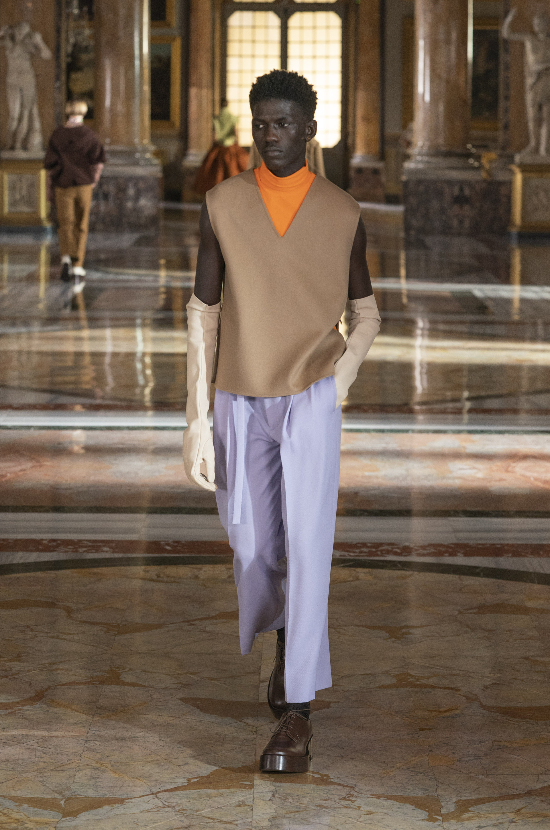 Roma, Galleria Colonna, Sala grande. Un luogo che toglie il fiato in cui Pierpaolo Piccioli scegli di far sfilare con una delicatezza leggiadra i capi della sua collezione più alta in cui sceglie di rienserire la figura maschile. La colonna sonora è DEI Massive Attack con il loro leader, Robert Del Naja, con cui il direttore creativo di Valentino ha lavorato a un «docu-film» che sarà presentato nei prossimi giorni.