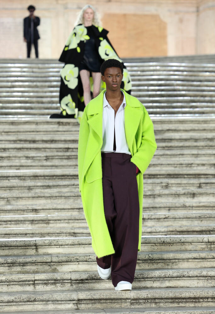 Dalla Scalinata dì Trinità dei Monti scendono 103 look che raccontano una bellezza diversa. Modelle di colore, per la maggior parte, e ragazzi gender fluid. Una bellezza inclusiva che poco si è vista nella storia della Haute Couture. D’altra parte la bellezza da sempre è al centro del savoir-faire della Maison Valentino. Il movimento lungo la scalinata carica di storia rimanda ad altri movimenti e momenti di moda, lungo le stesse scale, che diventano adesso estensione dell’Atelier. La visione d’insieme è un’esplosione di colore. Centrale il Rosso Valentino e poi i nuovi Pantone creati da Piccioli. Il giallo line, il rosa shocking, e poi turchese, argento, blu elettrico e il nero più elegante, una palette che veste indifferentemente abiti maschili o femminili. Una nuova bellezza armonica, che non obbedisce a canoni estetici prefissati, che racconta un glamour elegante nella sua imperfezione.