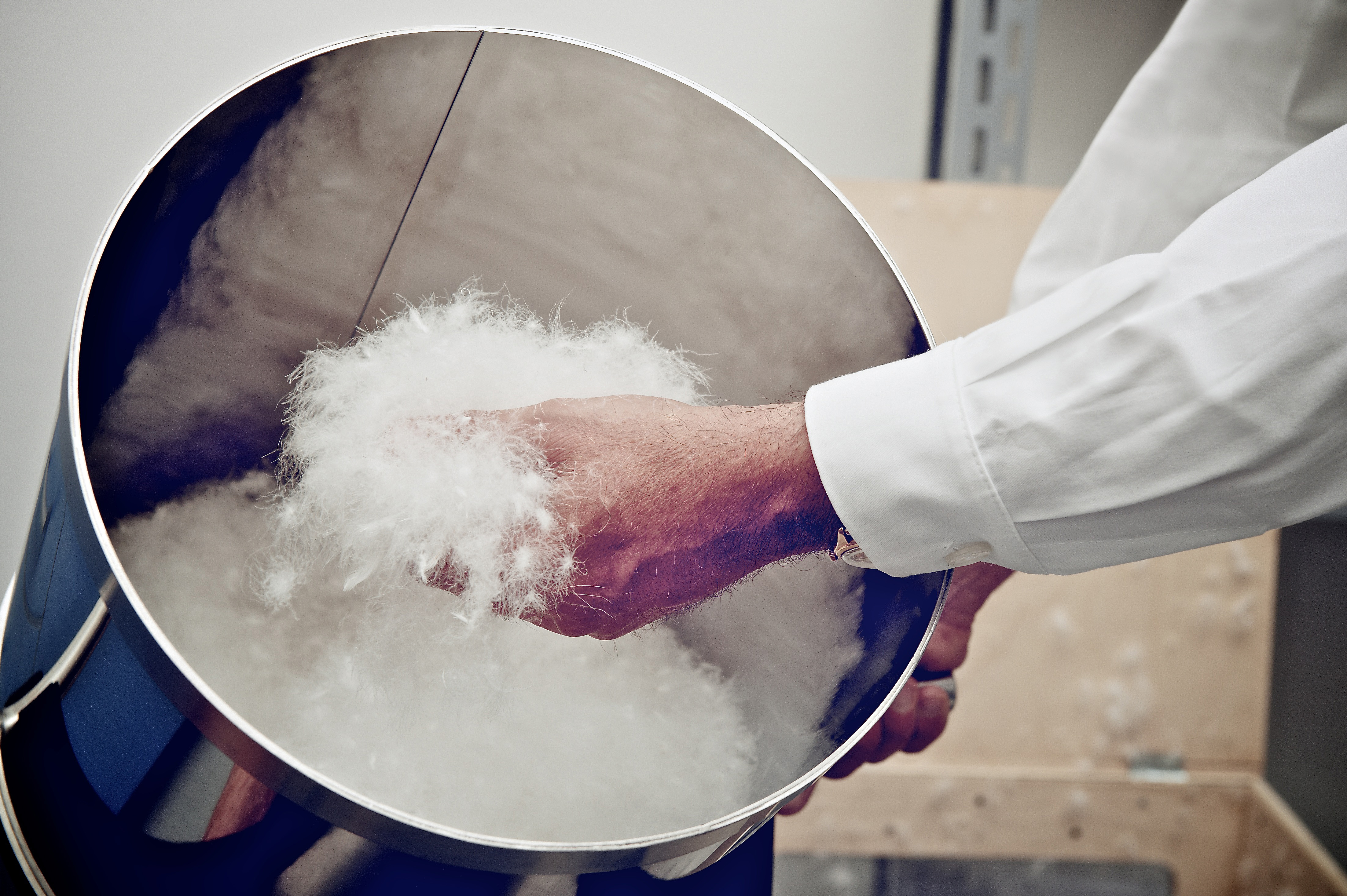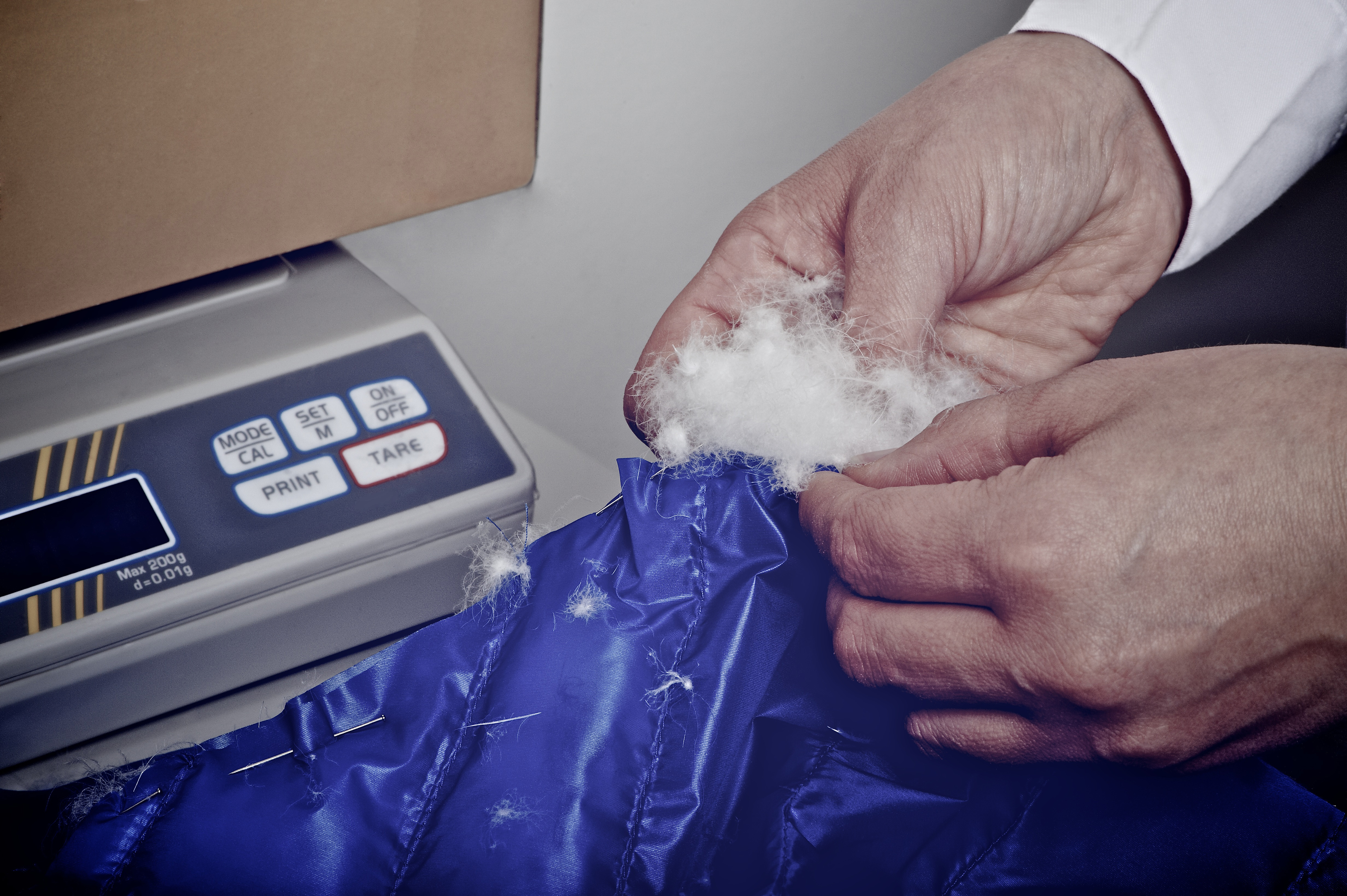 La quantità di piumino ideale per riempire ogni parte di un capo viene determinata in ambiente controllato: 20° di temperatura e 60% di umidità