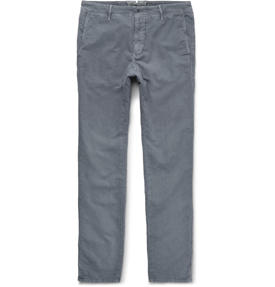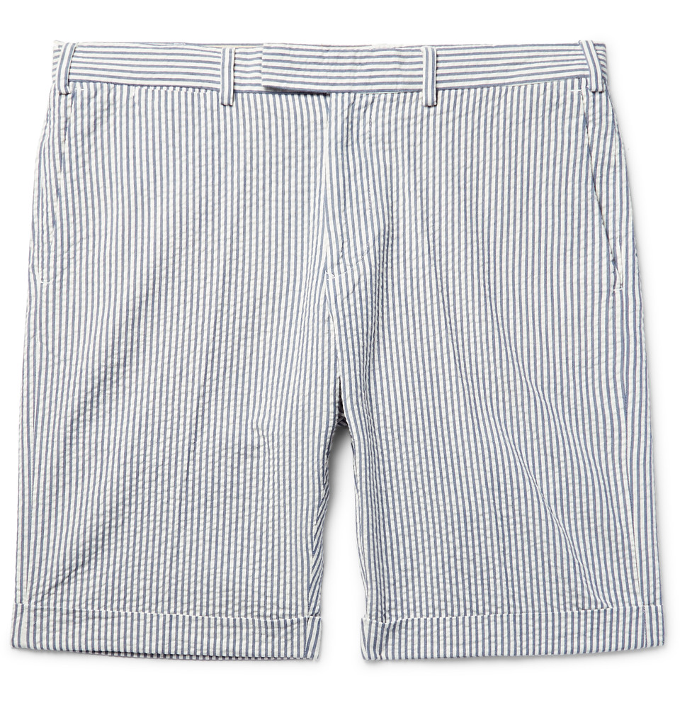Dentro lo stretto necessario. Per passeggiare sul lungomare si indossano bermuda in seersucker, come quelli di Gant Rugger, un po’ preppy, con risvolto al ginocchio e chiusura zip e bottone coperto, abbinati alla camicia in misto lino e cotone chambray di Boglioli con colletto alla coreana e taglio arrotondato, da portare con le maniche leggermente risvoltate. Altro look, per l’ora del tramonto: i chinos in cotone grigio fumo di Incotex, un capo evergreen che acquisisce valore con l’usura. Si risvoltano alla caviglia e si abbinano a t-shirt a righe come quella di Massimo Dutti, in perfetto stile marinier.