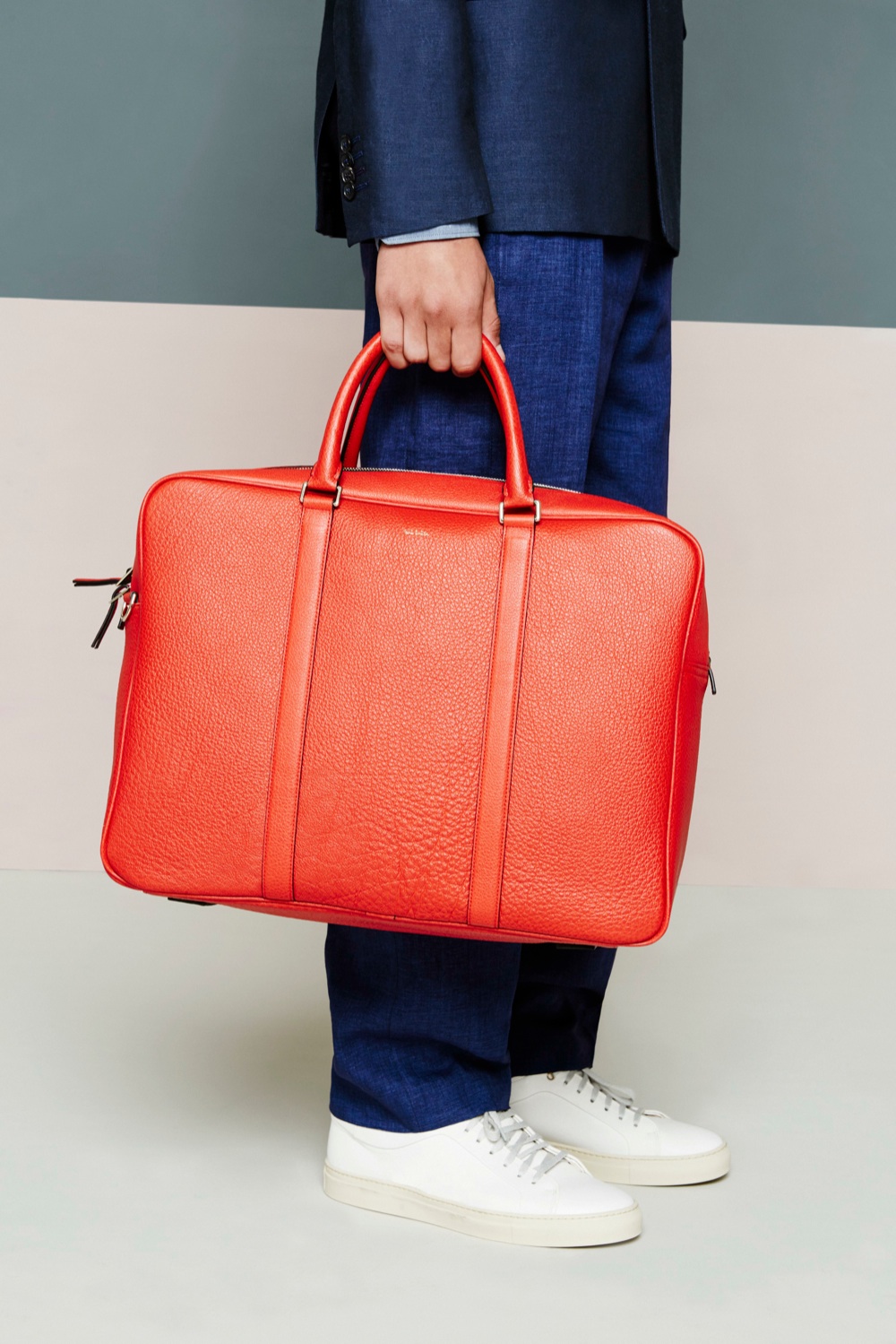 Più formali dello zaino, eleganti anche con un casual friday. Le borse per l’ufficio si colorano di nuance accese per brindare all’arrivo della stagione calda. Lo fa Paul Smith che porta in passerella una ventiquattrore in pelle italiana martellata dalle linee decise, squadrate di un arancio brillante che illumina completo blu doppiopetto e sneaker bianche.