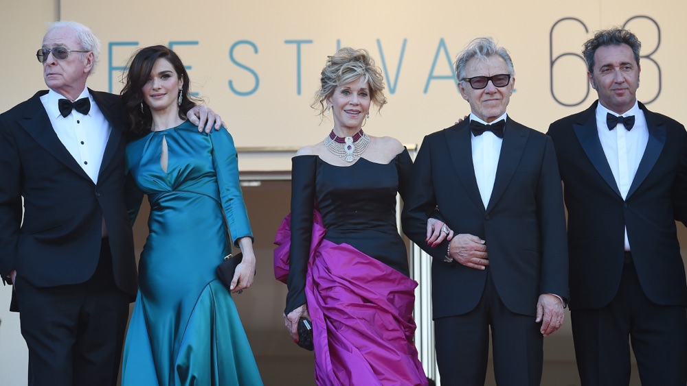 (From L) British actor Michael Caine, British actress Rachel Weisz, US actress Jane Fonda, US actor Harvey Keitel and Italian director Paolo Sorrentino pose as they arrive for the screening of the film “Youth” at the 68th Cannes Film Festival in Cannes, southeastern France, on May 20, 2015. AFP PHOTO / ANNE-CHRISTINE POUJOULAT (Photo credit should read ANNE-CHRISTINE POUJOULAT/AFP/Getty Images)
