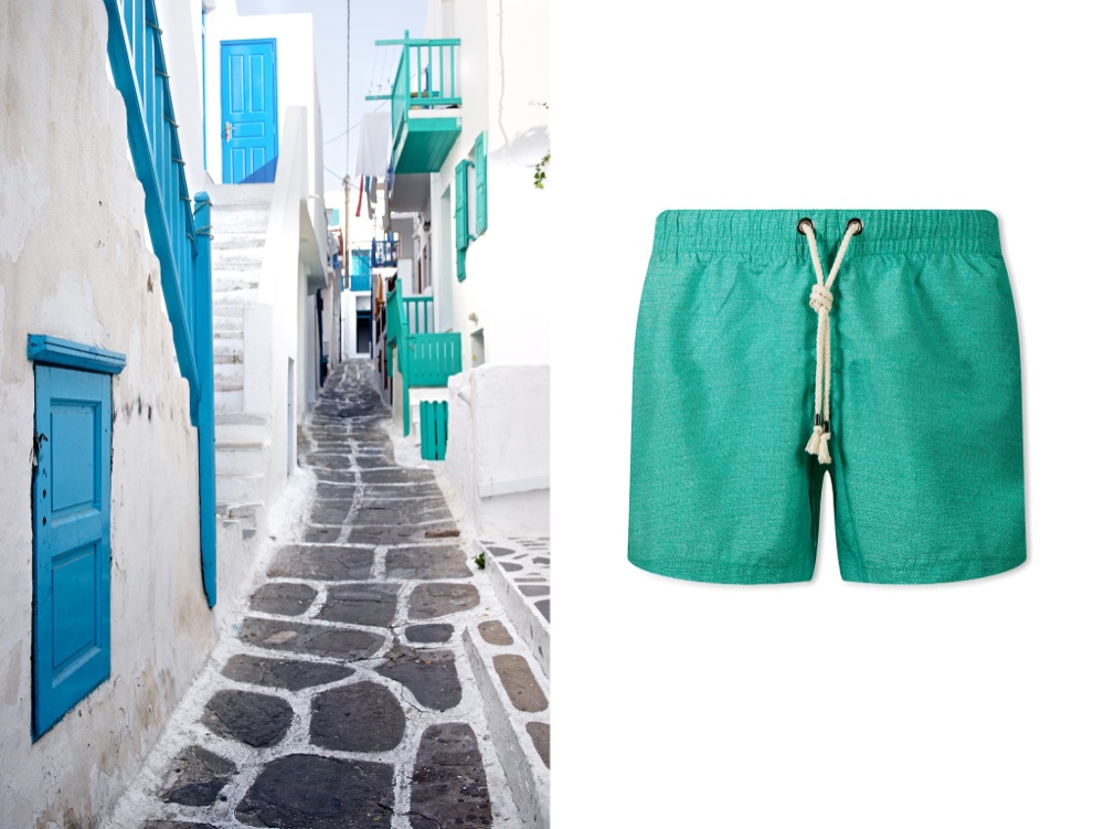 Via. Si parte. Destinazione: un’isola in mezzo al mare. Quelle più cool, ovviamente. Quest’estate si vola in Grecia, a bere ouzo sulle terrazze di Santorini o con i piedi nella sabbia dei beach bar di Mykonos (nuovissimo il Rakkan Diesel Beach Club meta esclusiva per i trendsetter che approdano sull’isola). Il costume fa pendant con il colore delle acque cristalline dell’isola e con le imposte delle piccole abitazioni bianco latte. Blu, azzurro, verde acqua, come lo short di Xarifa dedicato al viaggio con stampa all over effetto canvas declinata in nei toni dell’acquerello in tessuto Polyesterultra-light manoseta che pesa solo 78g/mq, e che, promettono, si asciuga in pochi minuti. Si indossa con t-shirt bianca, cappello di paglia e sandali a ciabatta in cuoio (non proprio alla greca, che è meglio lasciar indossare alle girls) con ampia fascia frontale, bordo sagomato e doppia fibbia, come da dna della maison Santoni.