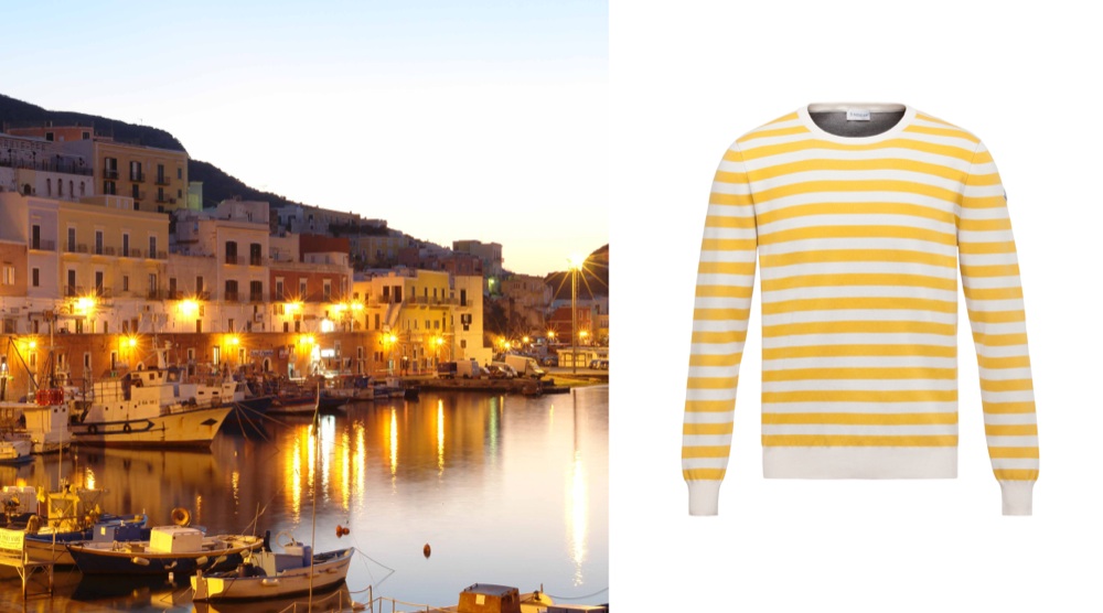 Risalendo il Mediterraneo si approda nelle Isole Pontine veleggiando tra Ponza e Ventotene, visitando l’Isola di Santo Stefano, ex-carcere e riserva naturale. In barca si viaggia leggeri. Nella weekend bag però meglio infilare almeno un maglioncino di cotone, come quello a righe gialle di Moncler come le luci che si accendono a Ponza dopo il tramonto, da abbinare agli shorts in cotone Dockers per una cena sulla terrazza di Orestorante. Un cadeau da portare a casa? Il braccialetto in corda con allacciatura ad ancora in metallo dorato.