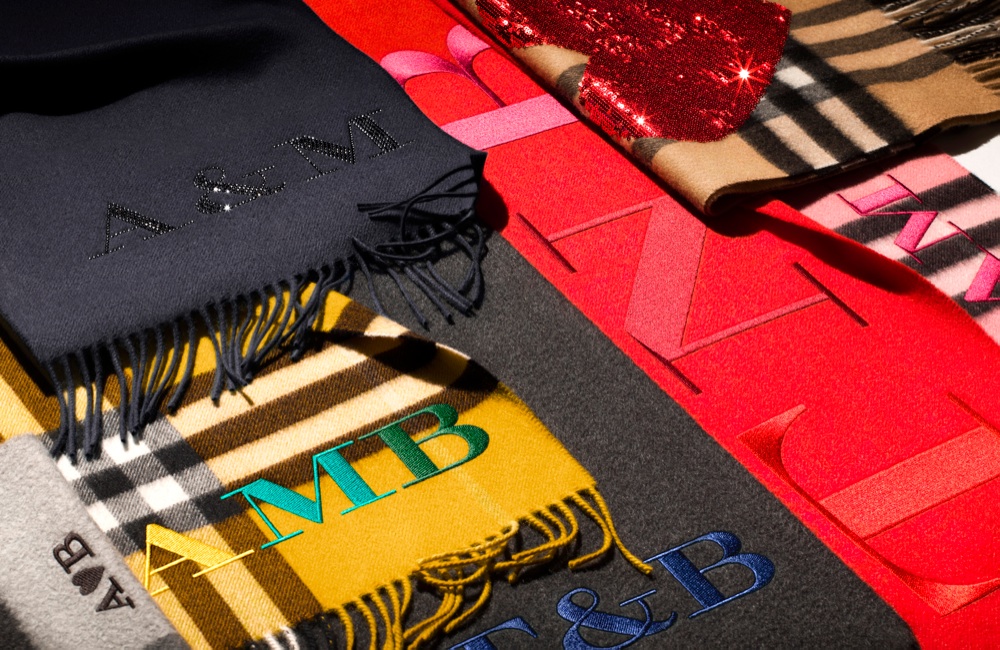 Per la stagione fredda Burberry ritorna con il suo servizio di monogrammi con nuove aggiunte alle opzioni di personalizzazione destinate alle sciarpe in cashmere. Quindici colori di filo, per un totale di quarantacinque combinazioni e la possibilità di aggiungere nuovi caratteri anche di dimensioni più grandi. La collezione di sciarpe Burberry è disponibile in oltre 30 colori di cashmere scozzese tessuto su un telaio tradizionale, lavato poi nelle acque di Elgin e di Ayr e finito dalle mani di abili artigiani che si tramandano la tecnica di generazione in generazione.