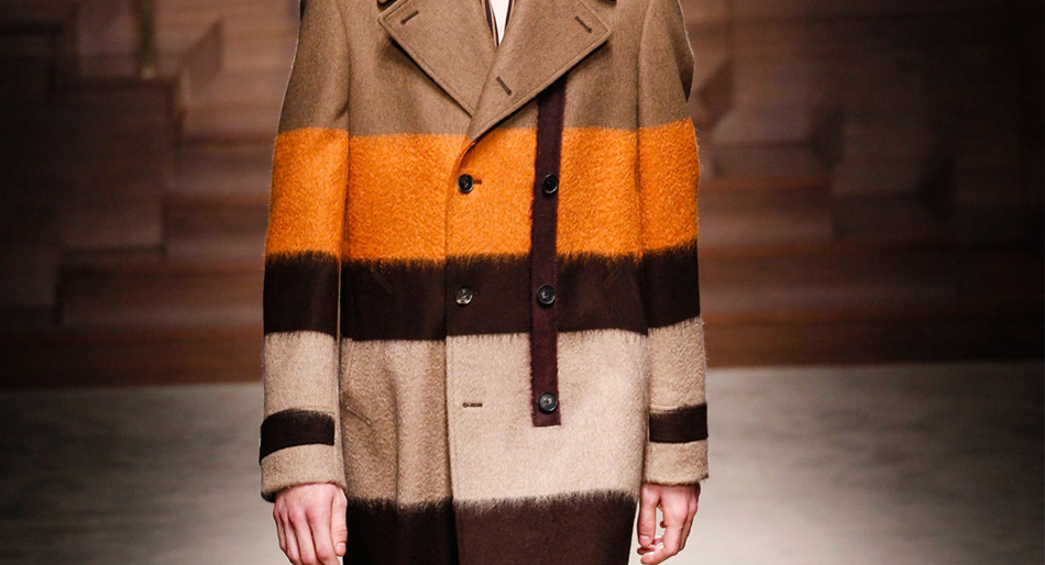 Il cappotto, uno dei must have per eccellenza del guardaroba maschile invernale per il 2014 torna in versione inedita: a righe. Non solo color cammello come la tradizione vuole, ma per la stagione 2014/15 in versione geometrica e super colorata: righe, dai toni blu e azzurro alternati in mohair per Louis Vuitton, colori piu polverosi e delicati invece per Kolor che sceglie nuance desaturate. Moderna, invece, la proposta del designer Daniele Alessandrini con un cappottino corto in cui le righe in lana mohair sono tono su tono, creando il giusto equilibrio tra eleganza e praticità. Infine, molto interessante il gioco di colori caldi e materiali differenti cha ha optato Salvatore Ferragamo per il suo coat un po’ oversize, da abbinare sia ll’abito classico che al denim scuro.