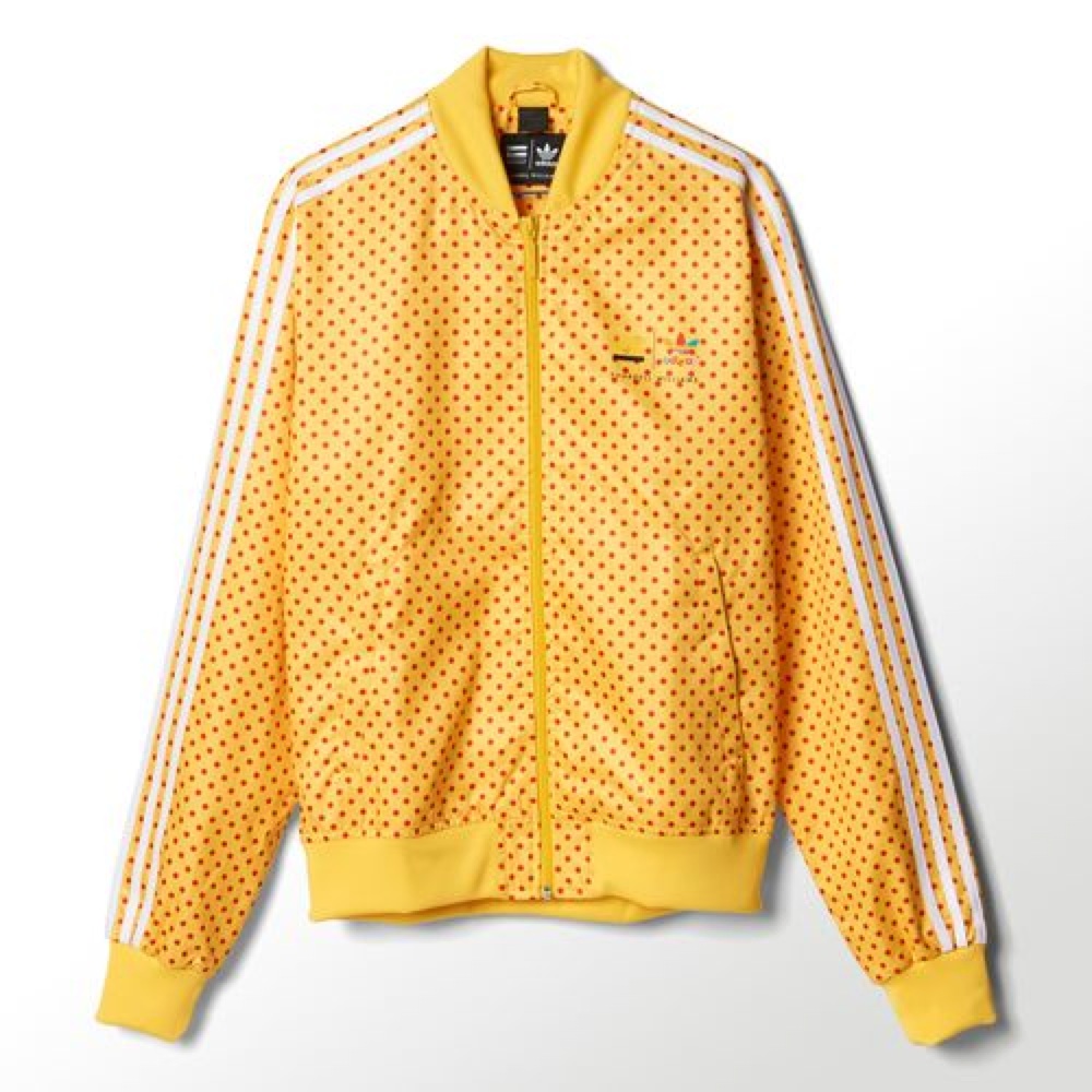 Sulla felpa con zip i colori dell'universo di Anderson si combinano con dei divertenti pois, Adidas Originals = Pharrell Williams