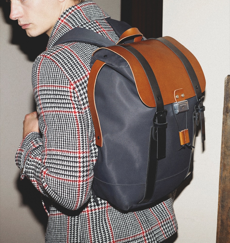 ZAINO VINTAGE. Dai sentieri di montagna al biker metropolitano. L’evoluzione del backpack guarda allo stile alpino, mutuando dettagli dal sapore antico come la patta in cuoio e le cinghie regolabili. Vintage nell’ispirazione, hi-tech nella scelta dei materiali: lo scompartimento centrale e gli spallacci ergonomici sono in tessuto polimerico, traspirante e anti-acqua. Zaino in pelle e tessuto tecnico, Mandarina Duck, euro 299; giacca doppiopetto in pura lana, Swiss Chriss, euro 372.