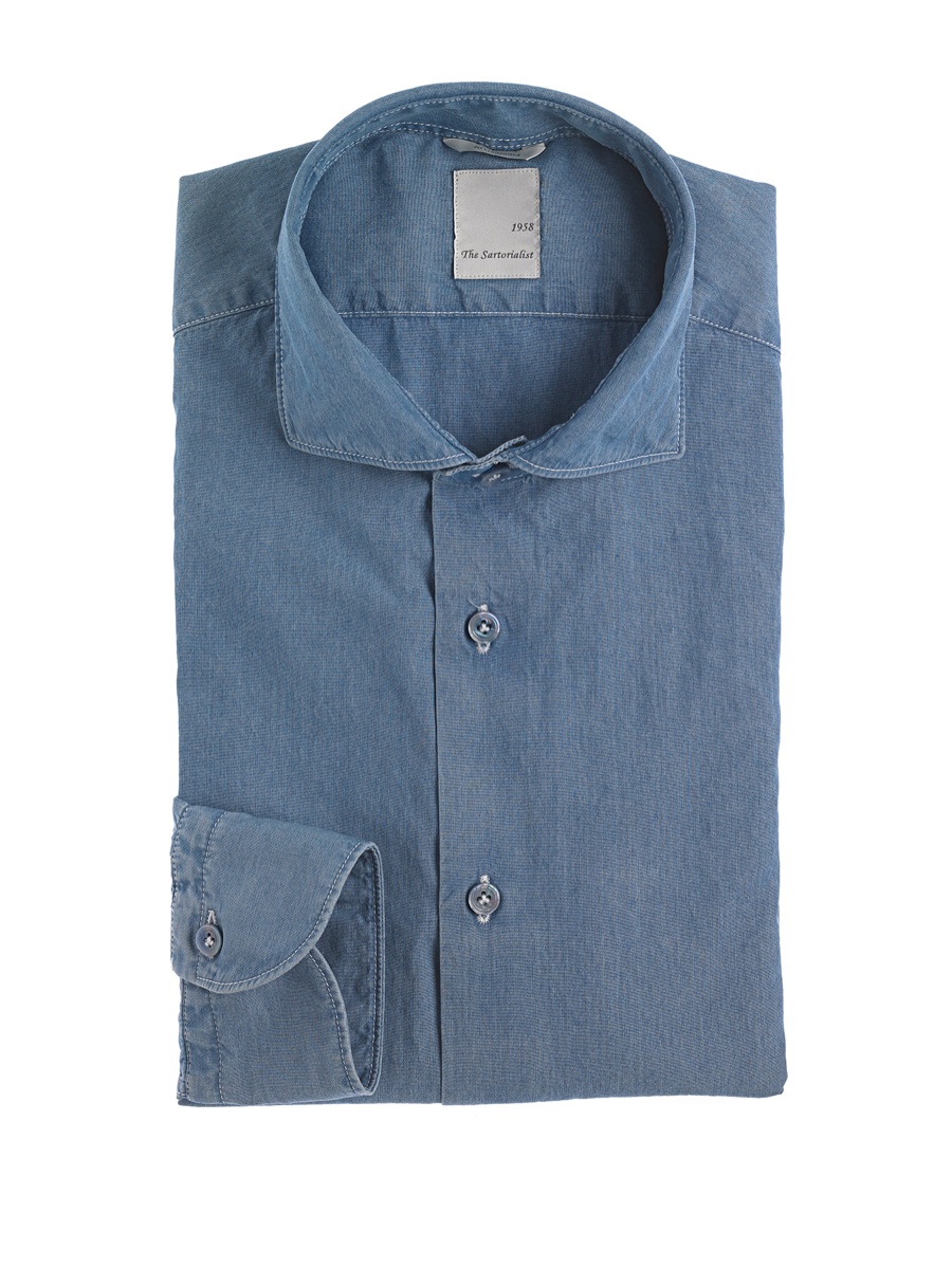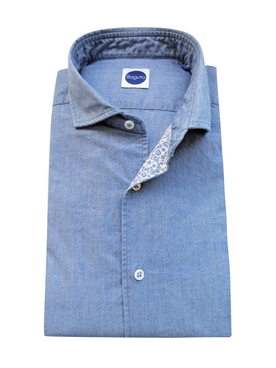 La camicia slim fit in chambray di Bagutta ha collo francese e planket interna, la striscia di tessuto doppiata sotto i bottoni, con stampa a fiorellini a contrasto