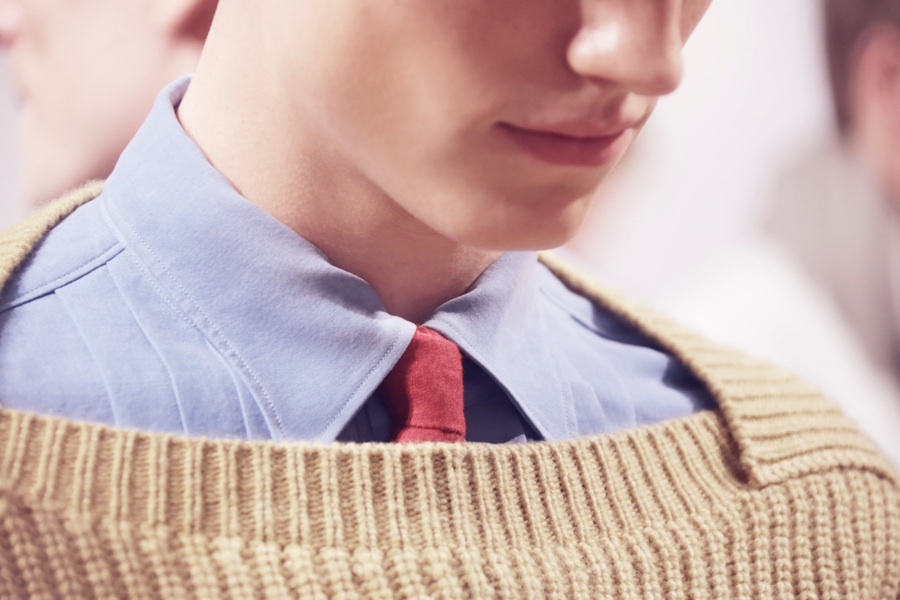 Total look Burberry Prorsum, collezione uomo primavera-estate 2014. Sotto al pull a scollo circolare in lana cashmere, la camicia in seta con piega sul davanti e cravattino in lino sovratinto effetto texture con nodo stretto (Photo: courtesy of press office)