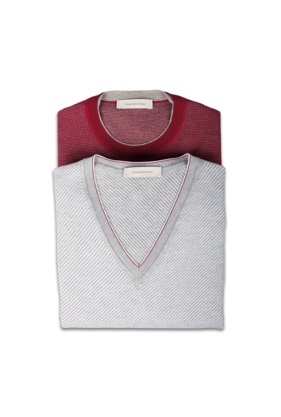 Girocollo in puro cotone con punto quadretto vichy e pull con scollo a V con motivo diagonale e profilo a contrasto. Tutto Ermenegildo Zegna