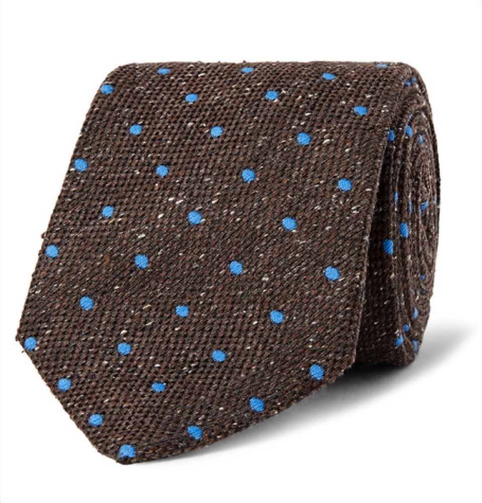 Il pois non passa mai di moda e ben si adatta a cravatte formali, come nella versione blu marino con puntini bianchi di Paul Smith, e più casual, come la proposta Dunhill in lana marrone con pois azzurri a contrasto, da indossare con una giacca di tweed e un blazer blu scuro.