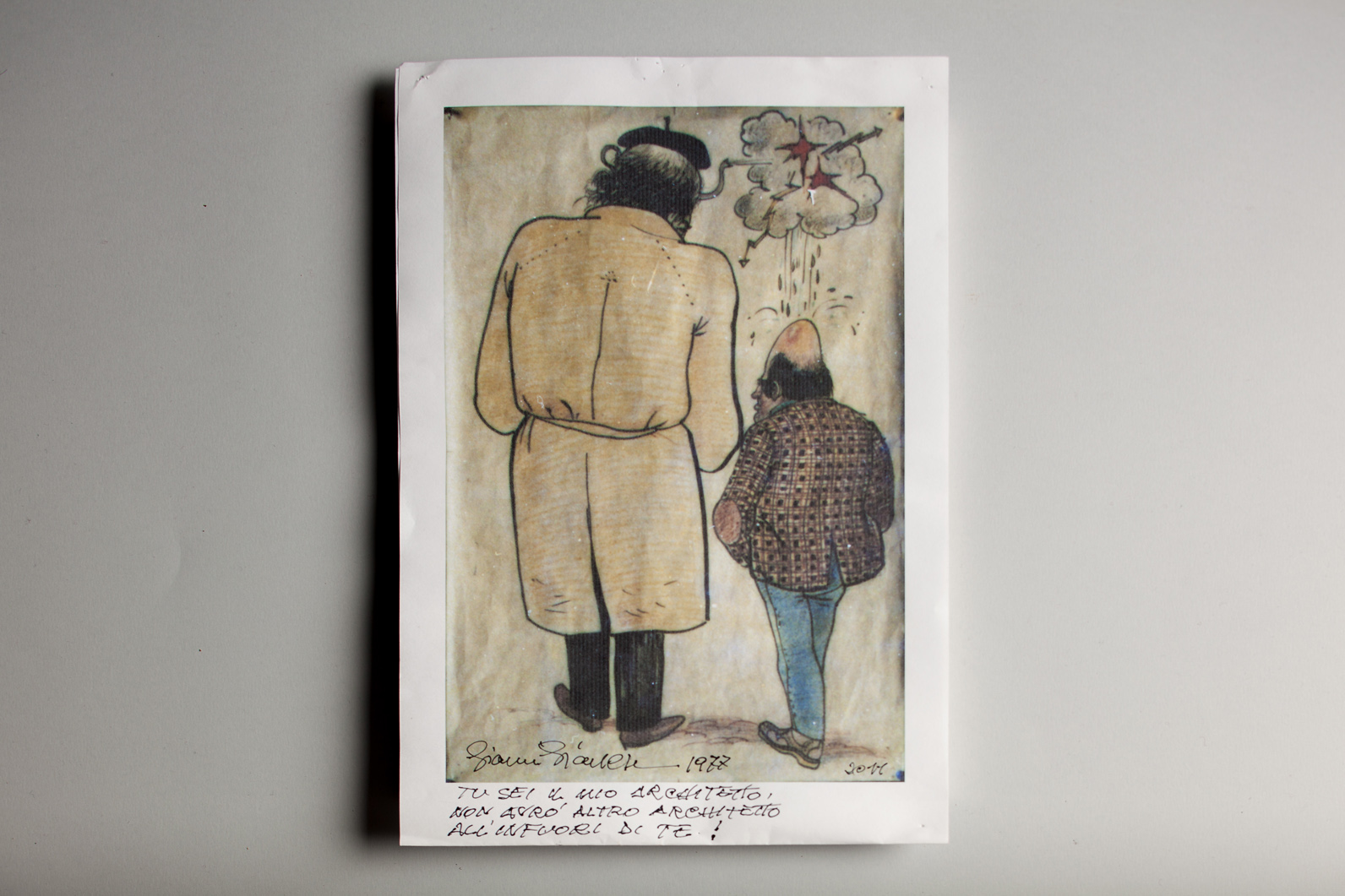 Una caricatura di Dante Ferretti, figura minuta accanto alla possenza di Fellini: il regista con un bollitore al posto della testa, da cui escono una nuvola, pioggia, fulmini. È stata realizzata dal fumettista e scultore Gianni Gianese nel 1977. Sul foglio si legge: «Tu sei il mio architetto, non avrò altro architetto all’infuori di te!».