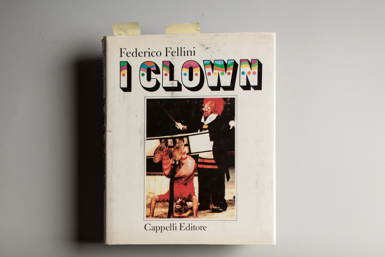 Per cercare l’ispirazione Ferretti sfoglia tantissimi libri, come quello dedicato ai clown di Fellini, in cui un post-it è incollato sul paginone di un circo antico.