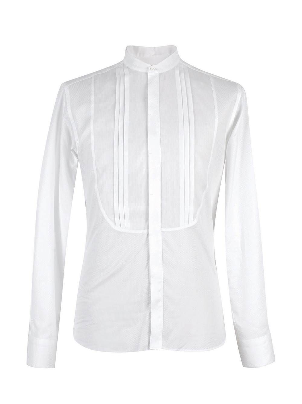 Ma è la sera il momento nel quale l’eleganza raggiunge il suo apice, contemporanea ma dall’allure retrò, modernizzata grazie alla mancata adesione a dei canoni formali troppo spiccatamente sixties: lo smoking è spezzato, con il blazer in velluto e le fodere interne stampate, mentre i pantaloni in lana si arricchiscono di motivi grafici, gessati o check, garbati, british ma con personalità. Il papillon è a pois, ironico: il suo contraltare perfetto è l’impeccabile camicia, con il collo alla coreana e la pettorina dai profili in seta.